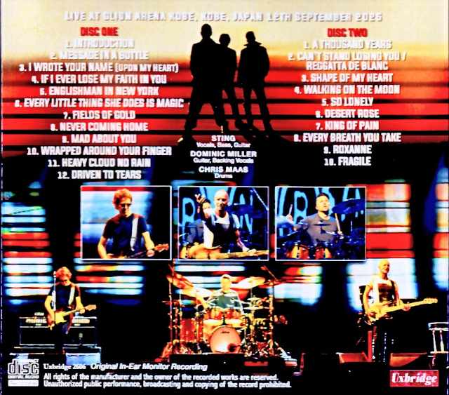 This full-length recording of the 1 hour and 49 minutes of the memorable September 12th live performance at GLION ARENA KOB in Kobe, the first day of the six-date "STING 3.0 Tour" in 2025, was captured via in-ear monitor interception. This recording is the original master recording of Sting's IEM audio, intercepted at the venue that day. While there are some countdowns and clicks, the band sound and Sting's vocals are perfectly captured on a stereo soundboard directly connected to the mix desk, without the usual mix imbalances often associated with IEM interception. The "3.0 Tour," which began touring around the world last year, has finally arrived in Japan. While the official "3.0 LIVE" release had been released, one might expect the set to be similar, the set has undergone significant changes. As Police numbers, it includes "So Lonely," "Walking On The Moon," "King Of Pain," and "Every Little Thing She Does Is Magic," as well as solo numbers such as "Fragile," "If I Ever Lose My Faith In You," "Heavy Cloud No Rain," "A Thousand Years," "Desert Rose," and "Mad About You," which are all numbers that could not be heard officially, and it will be fun to see the set changes in various places in the future. Anyway, this is a Japan-only memorial item that perfectly reproduces the first day's performance in Japan at the soundboard level. Live at GLION ARENA KOBE, Kobe, Japan 12th September 2025 : from IEM Original Masters Disc 1 : 1. Introduction 2. Message in a Bottle 3. I Wrote Your Name (Upon My Heart) 4. If I Ever Lose My Faith in You 5. Englishman in New York 6. Every Little Thing She Does Is Magic 7. Fields of Gold 8. Never Coming Home 9. Mad About You 10. Wrapped Around Your Finger 11. Heavy Cloud No Rain 12. Driven to Tears Disc 2 : 1. A Thousand Years 2. Can't Stand Losing You / Reggatta de Blanc 3. Shape of My Heart 4. Walking on the Moon 5. So Lonely 6. Desert Rose 7. King of Pain 8. Every Breath You Take 9. Roxanne 10. Fragile Sting - vocal, bass, guitar / Dominic Miller - guitar / Chris Maas - drums