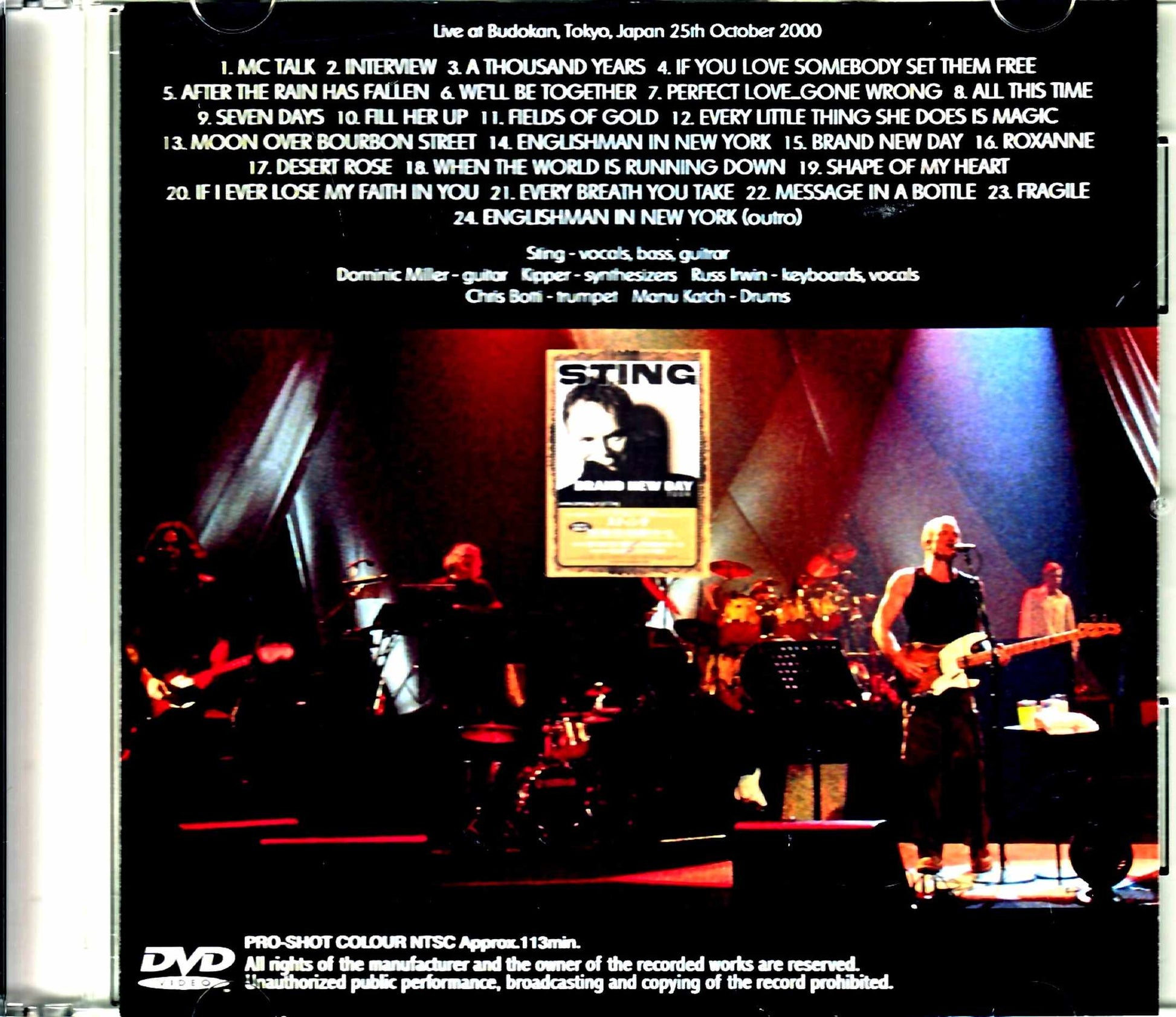 The Japanese tour was held during the period when "BRAND NEW DAY" won two Grammy Awards and became a triple platinum hit in the US. A pro shot that symbolizes this performance has been decided to be released. This work was filmed at the "October 25, 2000: Nippon Budokan" performance. This is a multi-camera pro shot. Sting is always active in live performances, but during the "BRAND NEW DAY" era, he carried out a particularly large-scale world tour. As a result, the number of performances in Japan was the highest ever (along with 1988). First, let's look back at the overall picture of the tour and check the position of the show. 1999 {"BRAND NEW DAY" released on September 28th} October 14th - December 9th; North America #1 (42 performances) ← *Official UNIVERSAL AMPHITHEATRE 2000: January 7th - April 10th; Europe #1 (59 performances), April 26th - 30th; North America #2 (3 performances), May 6th - June 17th; Europe #2 (29 performances), June 23rd - September 12th; North America #3 (57 performances), September 23rd - 29th; South Africa (5 performances), October 14th - 26th; Japan (9 performances) ←★Here★, November 9th - 22nd; Australia (11 performances) 2001: January 12th - February 3rd; Latin America/North America #4 (13 performances), April 19th - 30th; Middle East/Europe #3 (7 performances), May 4th - 26th; North America #5 (17 performances), May 31st - July 29th; Europe #4 (45 performances)This is Sting from 1999 to 2001. Not only was it a full two years long, but the sheer number of performances, over 170, and the scale of conquering five continents was overwhelming. This tour was also recorded as the official video work "LIVE FROM THE UNIVERSAL AMPHITHEATRE," but the Nippon Budokan performance in this work was recorded about a year later. It was the eighth of nine performances. This show was also known for being broadcast on television by a certain commercial station, and has become a classic symbolizing "Sting in 2000." This work is also that television broadcast. It was made into a DVD from an air check master that recently appeared on the Internet. The quality is superb. The image quality is analog due to the era, and the screen feels a little dark by modern standards, so it is hard to say that it is "completely official class!", but it can be said that it is sufficient by the standards of the time. Moreover, the master freshness is wonderful, and there is almost no crushing due to dubbing or running distortion due to master deterioration. You can enjoy the appearance of Sting, who was at the forefront of the new millennium (an obsolete term), with its lustrous visual beauty. The beauty of the image is depicted in a full show that is different from the official video. Let's organize the set, including the difference. 70s/80s: The Police: Roxanne (★), Message In A Bottle, When the World Is Running Down (★), Every Little Thing She Does Is Magic, Every Breath You Take, Blue Turtle's Dream: If You Love Somebody Set Them Free, Moon Over Bourbon Street, Nothing Like The Sun: We'll Be Together, Englishman In New York, Fragile, 90s: Soul Cage: All This Time (★), Ten Summoners' Tales; Seven Days, Fields Of Gold (★), Shape Of My Heart (★), If I Ever Lose My Faith In You (★), Brand New Day: A Thousand Years, After The Rain Has Fallen, Perfect Love...Gone Wrong, Fill Her Up, Brand New Day, Desert Rose *Note: The ★ mark indicates songs that cannot be seen in the official video "LIVE FROM THE UNIVERSAL AMPHITHEATRE". ...And so on. It is as follows. While focusing on the three albums "...NOTHING LIKE THE SUN", "TEN SUMMONER'S TALES" and "BRAND NEW DAY", a wide range of masterpieces from his career are selected. Perhaps because it has been more than a year since the album was released, you can enjoy the greatest hits with a thicker selection of classics than the official video. The program's unique production also gives a sense of the times. In the commentary corner at the beginning, Sting talks about his commitment to charity, and also includes a unique interview with him in Japan. He talks about his thoughts on the Nippon Budokan, the aim of the set list, and his outlook for the 21st century, which are typical of foreign artists. It's a common topic, but for those of us who know him after that, it makes us feel nostalgic. 21 years have passed since the scene of this work. Sting has visited Japan many times since then, but this was the only large-scale Japan tour he has ever done. He exudes his prestige as a superstar in the music scene and sings his famous songs from the past. Budokan, Tokyo, Japan 25th October 2000 PRO-SHOT 1. MC Talk 2. Interview 3. A Thousand Years 4. If You Love Somebody Set Them Free 5. After The Rain Has Fallen 6. We'll Be Together 7. Perfect Love...Gone Wrong 8. All This Time 9. Seven Days 10. Fill Her Up 11. Fields Of Gold 12. Every Little Thing She Does Is Magic 13. Over Bourbon Street 14. Englishman In New York 15. Brand New Day 16. Roxanne 17. Desert Rose 18. When The World Is Running Down 19. Shape Of My Heart 20. If I Ever Lose My Faith In You 21. Every Breath You Take 22. Message In A Bottle 23. Fragile 24. Englishman In New York (outro) Sting - vocals, guitrar Dominic Miller - guitar Kipper - synthesizers Russ Irwin - keyboards, vocals Chris Botti - trumpet Manu Katch - Drums PRO-SHOT COLOR NTSC Approx.113min.