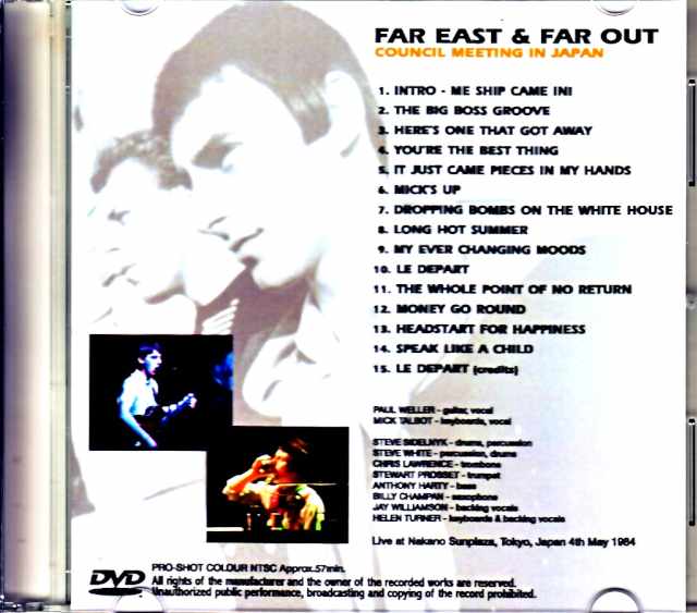 Live at Nakano Sunplaza, Tokyo, Japan 4th May 1984 PRO-SHOT (56:38) 1. Intro - Me Ship Came In! 2. The Big Boss Groove 3. Here's One That Got Away 4. You're The Best Thing 5. It Just Came Pieces In My Hands 6. Mick's Up 7. Dropping Bombs On The White House 8. Long Hot Summer 9. My Ever Changing Moods 10. Le Depart 11. The Whole Point Of No Return 12. Money Go Round 13. Headstart For Happiness 14. Speak Like A Child 15. Le Depart (credits) THE COUNCILLORS: Paul Weller: guitar & vocal Mick Talbot: keyboards & vocal Steve White: drums Chris Lawrence: trombone Stewart Prosset: trumpet Anthony Harty: bass Steve Sidelnyk: percussion Billy Champan: saxophone Jay Williamson: backing vocals Helen Turner: keyboards & backing vocals PRO-SHOT COLOUR NTSC Approx.57min.