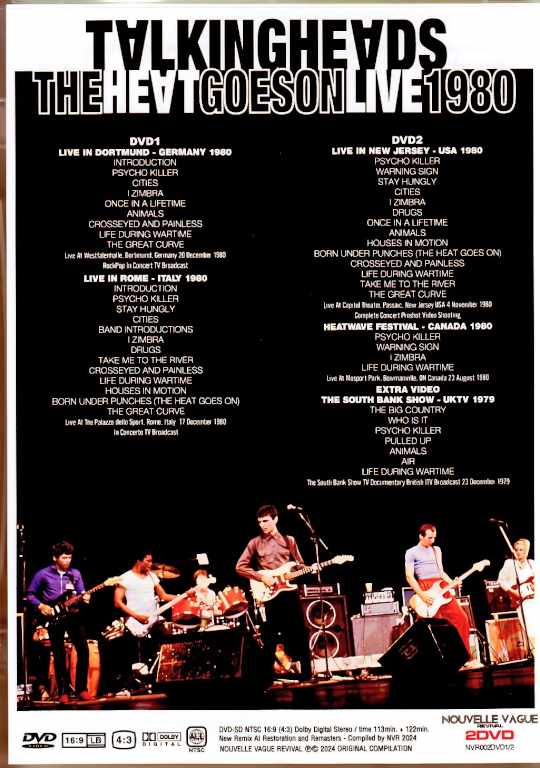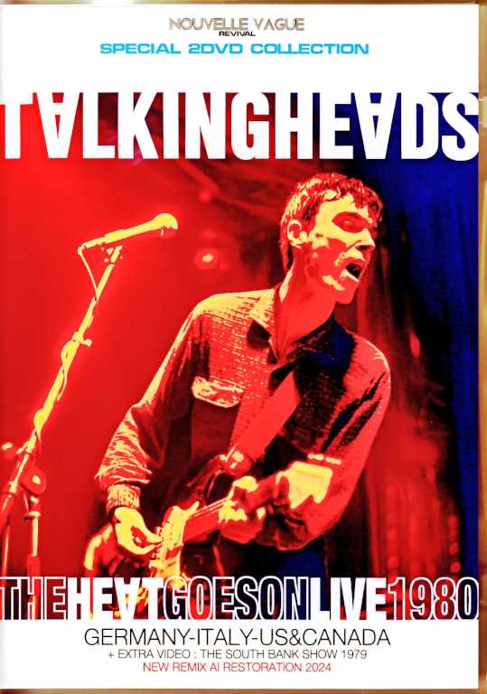 TALKING HEADS / THE HEAT GOES ON LIVE1980 GERMANY-ITALY-US&CANADA + EXTRA VIDEO : THE SOUTH BANK SHOW 1979 (NEW REMIX AI RESTORATION 2024) DVD1LIVE IN DORTMUND - GERMANY 1980 INTRODUCTION PSYCHO KILLER CITIES I ZIMBRA ONCE IN A LIFETIME ANIMALS CROSSEYED AND PAINLESS LIFE DURING WARTIME THE GREAT CURVE Live At Westfalenhalle, Dortmund, Germany 20 December 1980 RockPop In Concert TV Broadcast LIVE IN ROME - ITALY 1980 INTRODUCTION PSYCHO KILLER STAY HUNGLY CITIES BAND INTRODUCTIONS I ZIMBRA DRUGS TAKE ME TO THE RIVER CROSSEYED AND PAINLESS LIFE DURING WARTIME HOUSES IN MOTION BORN UNDER PUNCHES (THE HEAT GOES ON) THE GREAT CURVE Live At The Palazzo dello Sport, Rome, Italy 17 December 1980 In Concerto TV Broadcast DVD2 LIVE IN NEW JERSEY - USA 1980 PSYCHO KILLER WARNING SIGN STAY HUNGLY CITIES I ZIMBRA DRUGS ONCE IN A LIFETIME ANIMALS HOUSES IN MOTION BORN UNDER PUNCHES (THE HEAT GOES ON) CROSSEYED AND PAINLESS LIFE DURING WARTIME TAKE ME TO THE RIVER THE GREAT CURVE Live At Capitol Theater, Passaic, New Jersey USA 4 November 1980 Complete Concert Proshot Video Shooting HEATWAVE FESTIVAL - CANADA 1980 PSYCHO KILLER WARNING SIGN I ZIMBRA LIFE DURING WARTIME Live At Mosport Park, Bowmanville, ON Canada 23 August 1980 EXTRA VIDEO THE SOUTH BANK SHOW - UKTV 1979 THE BIG COUNTRY WHO IS IT PSYCHO KILLER PULLED UP ANIMALS AIR LIFE DURING WARTIME The South Bank Show TV Documentary British ITV Broadcast 23 December 1979 DVD-SD NTSC 16:9 (4:3) Dolby Digital Stereo / time 113min. + 122min. New Remix AI Restoration and Remasters - Compiled by NVR 2024 TALKING HEADS 1980 David Byrne - vocals, guitar Tina Weymouth - bass, guitar, keyboards, vocals, percussion Chris Frantz - drums Jerry Harrison - guitar, keyboards Adrian Belew - guitar, vocals Busta Jones - bass Bernie Worrell - keyboards Steve Scales - percussion Dollette McDonald - vocals, percussion.