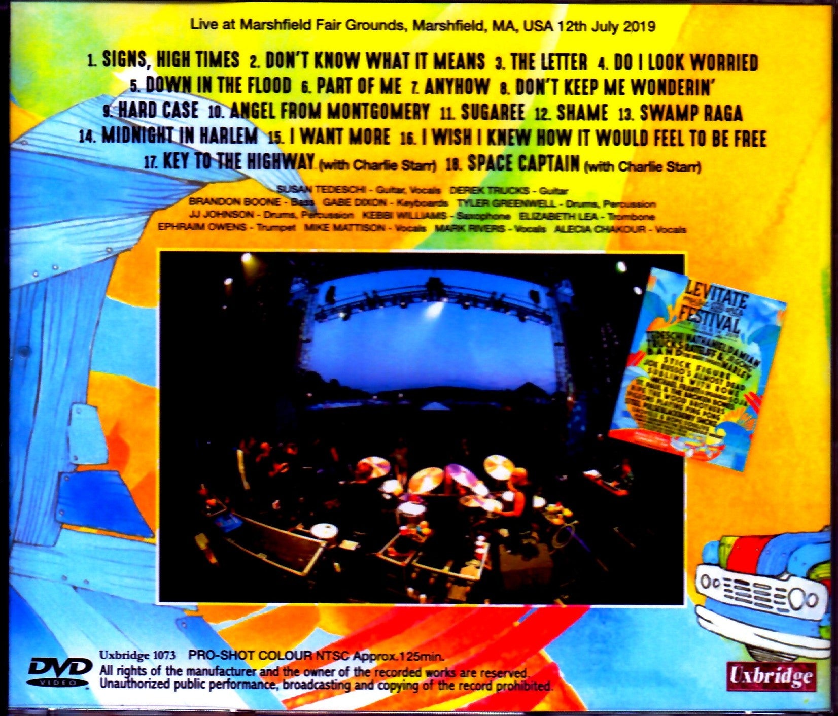 TEDESCHI TRUCKS BAND has fresh memories of their recent performance in Japan. Introducing the latest professional shots that will transform your short-term memory into solid memories. This work includes “Mansfield performance on July 12, 2019”. This is a multi-camera professional shot taken when he appeared at the music festival "LEVITATE MUSIC & ARTS FESTIVAL" in his home country of America. Before we get into the details, let's start with the show's position. Let's check it out in the context of the entire world tour, including the recent performance in Japan. ●2019, January 17th - March 2nd: North America #1 (23 performances) [SIGNS released on February 15th], April 2nd - 27th: Europe (17 performances), May 10th -25th: North America# 2 (12 performances) ・June 11th - 16th: Japan (5 performances) ・June 28th - August 24th: North America #3 (28 performances) ←★Coco★・September 27th - October 5th Sun: North America #4 (6 performances in NY)・November 6th-16th: North America #5 (8 performances) ●February 1st, 2020: London performance This is the schedule announced so far. The 2020 shows are already being decided. They are a band that primarily plays in North America, with a style that includes Japan and Europe in between. In 2019, the circuit will be divided into four major parts in North America. Under such circumstances, the Mansfield performance of this work was immediately after the performance in Japan. This was the 9th concert of "North America #3". This show was streamed live as it was a large-scale festival in their home country, and this work is a DVD version of that webcast. For this reason, the neatly arranged sound mix, the image quality that fully utilizes the latest digital technology, and the camera work that knows the key points are all impregnable. It can only be called completely official quality, and it would not be strange at all to make this work a bonus disc and call it a tour edition of "SIGNS"... No, in fact, it is a super superb multi-camera professional that I would definitely like to see. It's a shot. The perfect professional shot that can only be described as ``Just watch it!'' is a vivid depiction of that passionate performance only right after the Japan performance. In fact, “LEVITATE MUSIC & ARTS FESTIVAL” is an outdoor venue, and the TEDESCHI TRUCKS BAND performance was still high in the sun. Although the bright scene was different from the Japanese performance, the blazing blues rock was unmistakably the same as the enthusiastic performance I saw last month. Because of the multi-camera system, there are plenty of close-ups of each member and Derek's hands, and as the show progresses and the night gets darker, last month's scene finally flashes back to my mind. And what stirs up this feeling is a group of famous songs that I have heard even in Japan. We have analyzed and introduced the set in the Japan performance live album, but for comparison, let's organize it in the same style. ●REVELATOR (1 song)・Midnight in Harlem ●MADE UP MIND (2 songs)・Do I Look Worried, Part of Me ●LET ME GET BY (3 songs)・Don't Know What It Means, Anyhow, I Want More ●SIGNS/HIGH & MIGHTY (3 songs)・Signs, High Times, Hard Case, Shame ●Cover and others (8 songs)・The Letter (THE BOX TOPS), Down in the Flood (Bob Dylan), Don't Keep Me Wonderin' (THE ALLMAN BROTHERS BAND), Angel From Montgomery/Sugaree (John Prine/GRATEFUL DEAD), Swamp Raga (THE DEREK TRUCKS BAND), I Wish I Knew How It Would Feel to Be Free (Billy Taylor), Key to the Highway (blues standard), Space Captain (Joe Cocker) *Original artists are in parentheses ...and it looks like this. The TEDESCHI TRUCKS BAND changes every day, so it is different from any show in Japan, but the balance is different, but there are plenty of famous songs and covers that could be heard in the Japan performance. Among them, three songs were not performed in Japan. The famous song “Anyhow” from “LET ME GET BY,” “Swamp Raga,” which was also the song of Derek’s “ALREADY FREE,” and the Billy Taylor (or rather, Nina Simone) cover “I Wish I Knew How It.” “Would Feel to Be Free” will also be performed. No matter how many shows I watch, I can't help but wonder, "What's next?" You can fully enjoy the real pleasure of TEDESCHI TRUCKS BAND. Guest participation is also special. Don Was appeared at last month's Tokyo performance, but on this day Charlie Star of BLACKBERRY SMOKE participated. They co-starred in the last songs ``Key to the Highway'' and ``Space Captain.'' TEDESCHI TRUCKS BAND, the strongest live band of today. This is an official multi-camera pro shot where you can fully experience the latest stage for 2 hours. It's a video that cements the memory of the performance in Japan that just ended, but more than that, this work itself is a musical work that is equal to or better than "SIGNS". This is the 2019 definitive album that we fully recommend to those who experienced the live stage performance last month, as well as those who have not. Marshfield Fair Grounds, Marshfield, MA, USA 12th July 2019 PRO-SHOT 1. Signs, High Times 2. Don't Know What It Means 3. The Letter 4. Do I Look Worried 5. Down in the Flood 6. Part of Me 7. Anyhow 8. Don't Keep Me Wonderin' (with Gabe Dixon) 9. Hard Case 10. Angel From Montgomery 11. Sugaree 12. Shame 13. Swamp Raga 14. Midnight in Harlem 15. I Want More 16. I Wish I Knew How It Would Feel to Be Free 17. Key to the Highway (with Charlie Starr) 18. Space Captain PRO-SHOT COLOR NTSC Approx.125min.