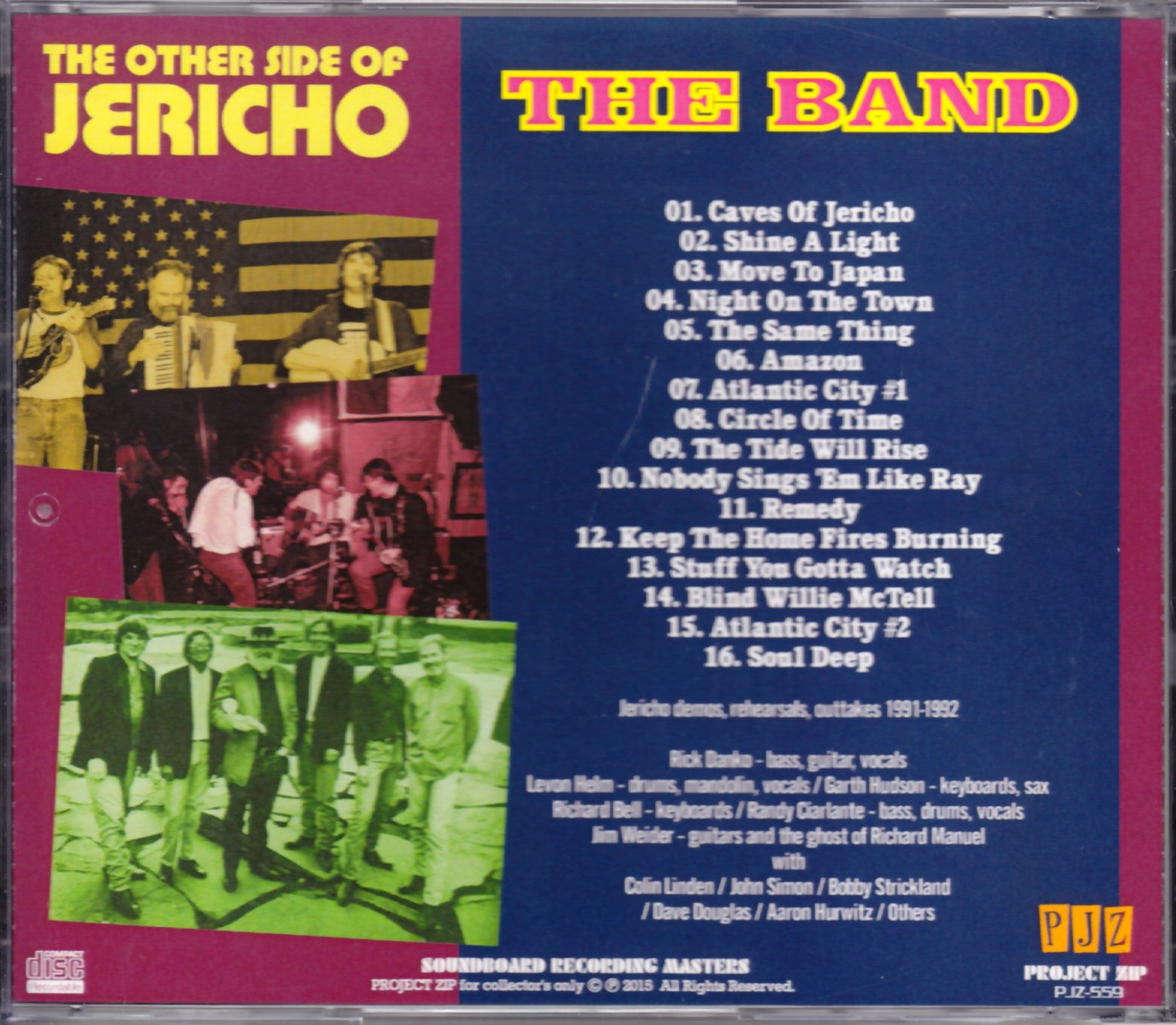 A collection of outtakes, including valuable demo tracks and rehearsal sound sources, from 1991 to 1992, when Robbie Robertson left the group and continued their activities with a new formation, is now available in master quality and sound sourced from those involved. Here is the board sound source. It was recorded mainly during the recording sessions for the album ``Jericho'', and is a collector's item with high documentary value as it is the culmination of the continued activities of the remaining members after Richard Manuel's death in 1986. 01. Caves Of Jericho/02. Shine A Light/03. Move To Japan/04. Night On The Town/05. The Same Thing/06. Amazon/07. Atlantic City #1/08. Circle Of Time/09. The Tide Will Rise/10. Nobody Sings 'Em Like Ray/11. Remedy/12. Keep The Home Fires Burning/ 13. Stuff You Gotta Watch/14. Blind Willie McTell/15. Atlantic City #2/16. Soul Deep [Jericho: Demos, Rehearsals, Outtakes 1991-1992]