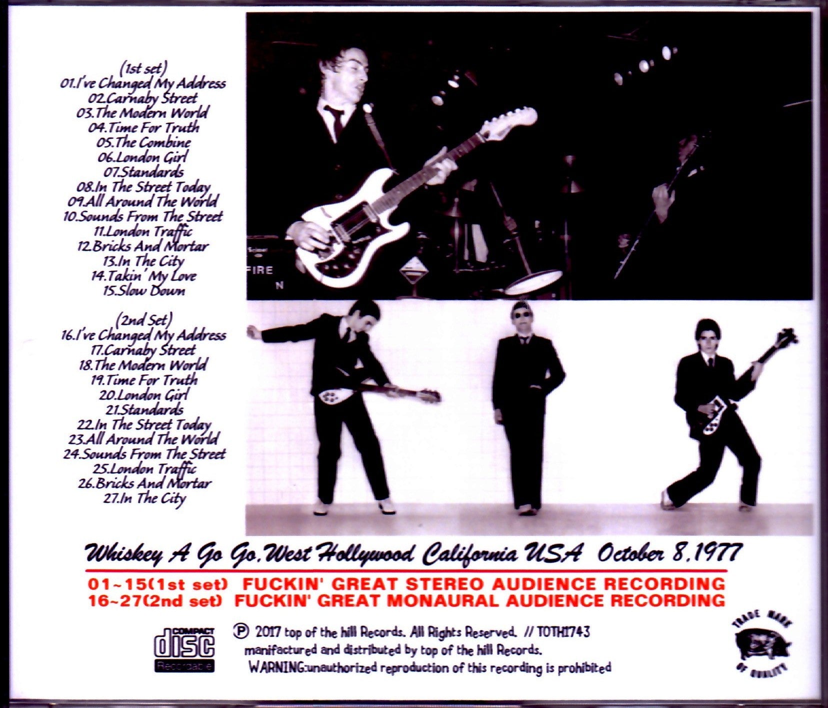 ~A treasured sound source recording the live performance at Whiskey A Go Go on October 8, 1977 from The Jam's first American tour is now available! ~ In 1977, when the London punk movement was swirling, about a month before the release of their second album ``This Is The Modern World'', on October 8th, the first day of their first American tour, they performed at the famous Whiskey A Go Go. A treasured sound source containing two live sets released! The first set is a rough stereo audience recording, but the guitar's drive feeling is recorded with an impressive sound image. And the second set is a reasonably good monaural audience recording for this era, well balanced, and although the texture is different from the first set, it is recorded with an equally impressive sound. The pitch deviation caused by both masters has been carefully corrected. They played 5 songs, mainly numbers from their first album, including the singles "All Around The World" and "Carnaby Street", as well as numbers from their second album, which will be released next month, "The Modern World" and "London Girl". Masu. This is a killer item that includes the memorable first stage of entering the United States! 01.I've Changed My Address 02.Carnaby Street 03.The Modern World 04.Time For Truth 05.The Combine 06.London Girl 07.Standards 08.In The Street Today 09.All Around The World 10.Sounds From The Street 11.London Traffic 12.Bricks And Mortar 13.In The City 14.Takin' My Love 15.Slow Down 16.I've Changed My Address 17.Carnaby Street 18.The Modern World 19.Time For Truth 20.London Girl 21.Standards 22.In The Street Today 23.All Around The World 24.Sounds From The Street 25.London Traffic 26.Bricks And Mortar 27.In The City 01~15 / 1st set 16~27 / 2nd set