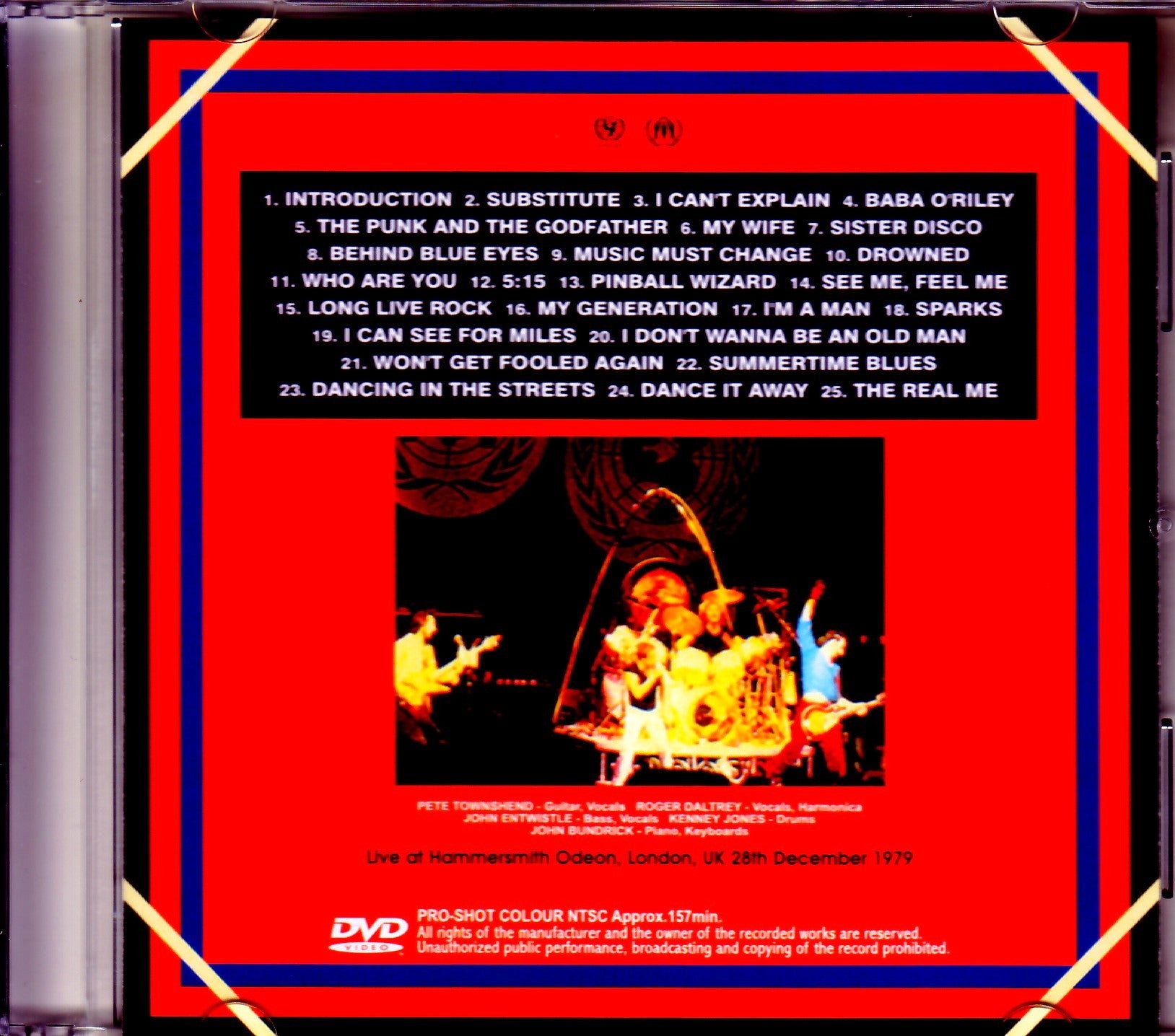 In conjunction with the release of The Who's CD title "ZURICH 1980", we have prepared the best items of The Who! This DVD is a complete recording of the Who's full set at the "Cambodian Refugee Relief Concert" held at the Hammersmith Odeon in London the year before "ZURICH 1980" with the finest professional shots and soundboard audio. . At this event, along with Paul McCartney, who proposed the project, The Who were given the same amount of time as a regular one-man concert, and received exceptional treatment (which is no surprise). Therefore, it is recorded for a long time of 2 hours and 37 minutes. Because there is a time code at the top of the screen, you can tell that it was an official shot and was used as an editing master for later TV broadcasts (this scene was also broadcast in Japan on NHK's " (Broadcast on Young Music Show). This board is a perfect recording of the original master without any loss of quality. In the broadcast version at that time, only three songs, Sister Disco, Behind Blue Eyes, and See Me, Feel Me, were broadcast due to time allocation with other performing artists. Only four songs with O'Riley added were included. Still, although I was able to confirm the brave figure of The Who who revived splendidly with Kenny Jones and John Rabbit Bandrick, it is an undeniable fact that it was unsatisfactory. What's more, the concert's live album is extremely rare as it has never been released on CD, perhaps due to rights issues. Therein lies the significance of this edition. This is a first-class document that conveys The Who's full stage performance with perfect camera work and audio. If there is no time code, it can be said that the quality is no problem even if it is officially released as it is. Pete has been using Schecter's Telecaster from the beginning, but at time code 6:46 of I Can't Explain, the guitar's sound stops due to trouble with the pedal switch. Taking this into consideration, I changed to a number 3 Les Paul for the next song, Baba O'Riley, but this also had the problem of being out of tune. Therefore, you can see the scene where they switch back to Schecter's Telecaster from the next song. This vivid stage pattern can also be confirmed only on this board. Roger's microphone-twirling action and Pete's fan (windmill) playing technique, which has become macho like a Greek statue, are in full swing from the beginning. Even if you're only interested in Who from the Keith Moon era, this is a video that you should watch and feel like you've been fooled. This fu is amazing. Please see with your own eyes the brave figure of The Who who has made a spectacular comeback after Moon's death. Live at Hammersmith Odeon, London, UK 28th December 1979 PRO-SHOT(UPGRADE) 1. Introduction 2. Substitute 3. I Can't Explain 4. Baba O'Riley 5. The Punk And The Godfather 6. My Wife 7. Sister Disco 8. Behind Blue Eyes 9. Music Must Change 10. Drowned 11. Who Are You 12. 5:15 13. Pinball Wizard 14. See Me, Feel Me 15. Long Live Rock 16. My Generation 17. I'm A Man 18. Sparks 19. I Can See For Miles 20. I Don't Wanna Be An Old Man 21. Won't Get Fooled Again 22. Summertime Blues 23. Dancing In The Streets 24. Dance It Away 25. The Real Me PRO-SHOT COLOR NTSC Approx.157min.
