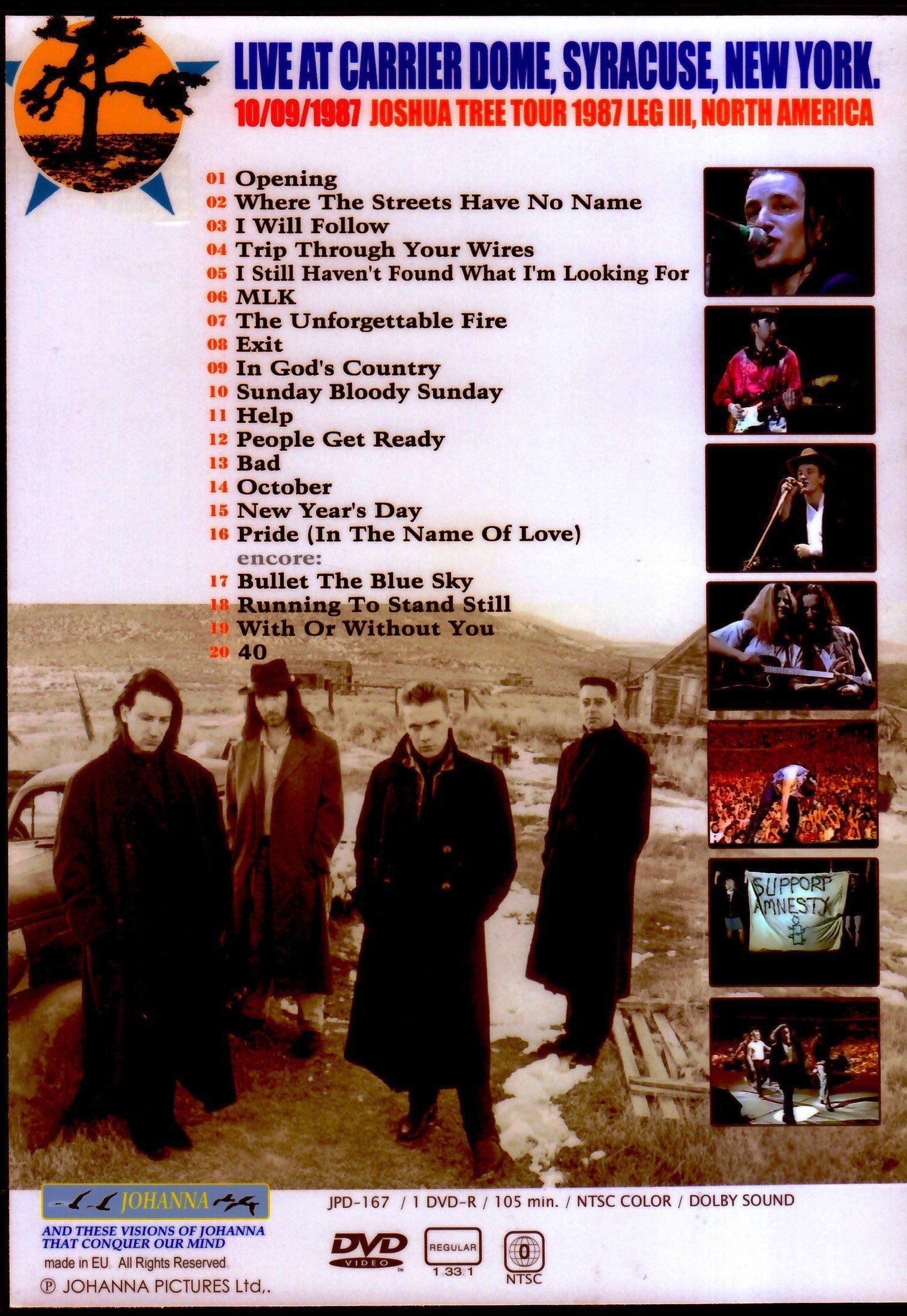 DVD 105 min. Where The Streets Have No Name / I Will Follow / Trip Through Your Wires / Sunday Bloody Sunday / Help / People Get Ready / New Year's Day / Pride / Bullet The Blue Sky / With Or Without You / 40 / others