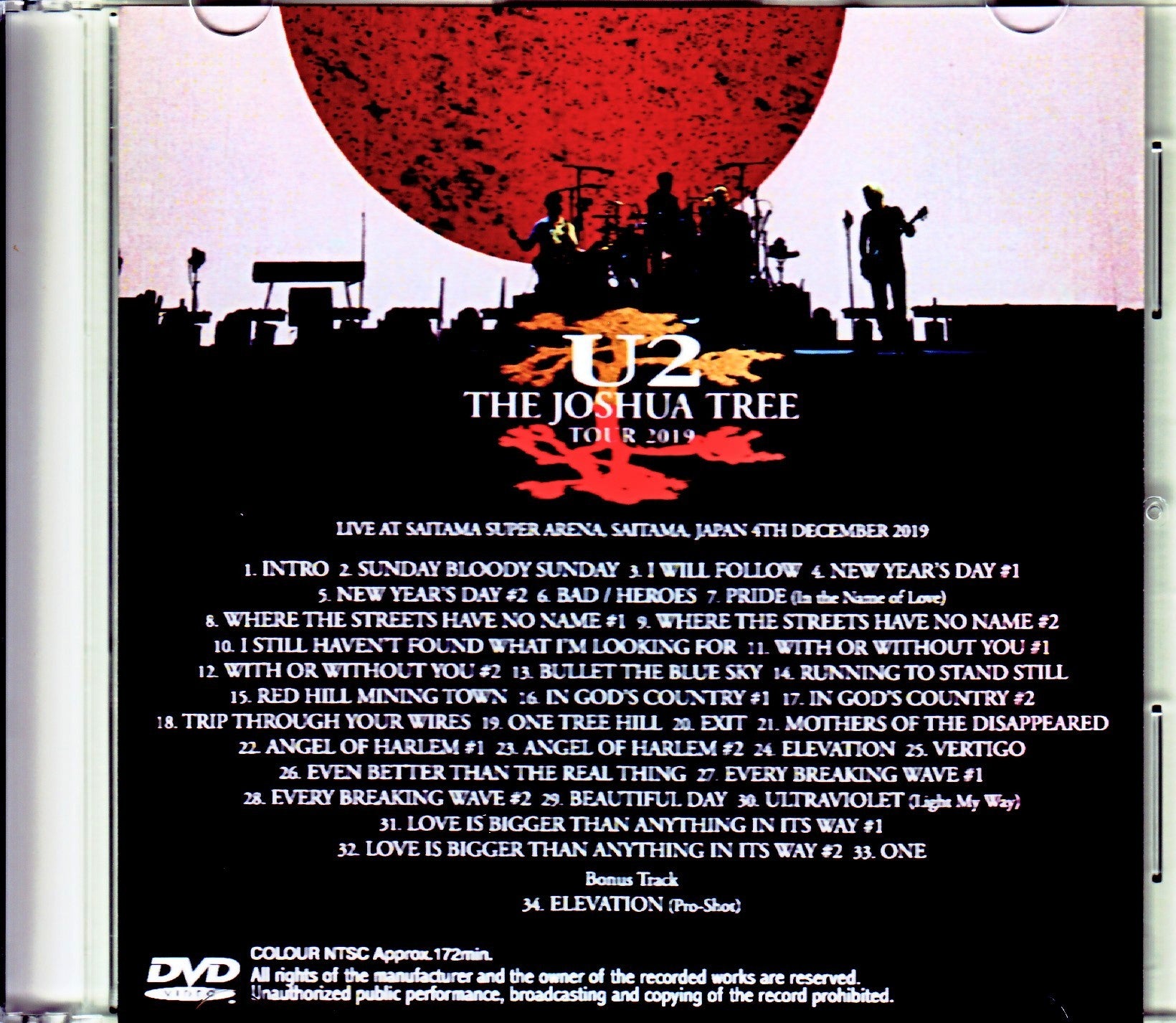 This work includes “December 4, 2019 Saitama Super Arena performance”. This is the audience shot. However, this work is not a continuous video shot by one photographer, but a combination of multiple shots. Some of you may be thinking of the video collection "SAITAMA SUPER ARENA 2019: THE VIDEO" that I introduced the other day, but this work is similar but different. The basics are the same, but this work is an "extended version" that has significantly increased the amount of footage instead of focusing on only the first day (with pro shots). I suddenly started talking about "the other day" and "expanded version", but for those who don't know, it might be "???", so let's start from the beginning. The basis of this work is an edited work that utilizes audience shots created by enthusiasts. However, it is not as frequent as multi-camera, and basically a full show is constructed by stacking videos of each song. Therefore, I can't say in a nutshell that ``the angle is ○○'' or ``the camera work is ◇◇,'' but what I can say in general is the spectacular scenery and ultra-high image quality. After all, this performance in Japan is a complete reproduction of a historical masterpiece for the first time in 13 years. The scene was overflowing with fans taking pictures, including those with smartphones, and a huge amount of footage began circulating immediately after the performance. It's only been a week since the show, so I guess they haven't done everything they can, but it still feels like they're on a different level from other bands. There is no doubt that they are choosing ``This is it!'' from that large amount of videos. Of course, depending on the song, the focus is on the sea of light from the giant screen or smartphone, so not all songs are directly shot, but in most scenes you can stare at the stage without any obstructions. And it's because your perspective changes with each song that you never get bored. The real experience is only seen from one angle, but in that case the skill of the photographer plays a big role. If you are not very experienced with photography, you may miss the highlight or the result may become monotonous. However, the viewpoint of this work changes with each song, so you will never get tired of it, and because of the careful selection, the highlights are well captured. It's a luxurious experience that feels like enjoying a full show while moving around in the special seats. ...And so far, this is an explanation of the last edition of U. This work is a re-edited version that has increased the amount of footage from the previous edition, and has also seamlessly and beautifully rearranged the choppy editing. As of the previous edition, all the songs from the show were included, but additional selections were made from the videos that appeared later. Contains 6 additional songs. And it's not just an increase in volume. Since it was added later, the quality exceeds the previous edition. If you have experienced the two-disc set, you will understand that the video quality was better on the second day than on the first day. This increased video is of a quality comparable to that second day. Furthermore, the final blow is the one take recorded at the end of this work. This is a pro shot from the first day in Japan that was officially released online. Although it is only the encore top “Elevation”, that huge spectacle is revived with the official multi-camera pro shot. It is truly Japan's highest quality video. A complete reproduction of “THE JOSHUA TREE” was released for the first time in Japan on “December 4, 2019.” This work can be viewed in its entirety from a variety of perspectives. Live at Saitama Super Arena, Saitama, Japan 4th December 2019 AMAZING SHOTS!!! (171:41) 1. Intro 2. Sunday Bloody Sunday 3. I Will Follow 4. New Year's Day #1 5. New Year's Day #2 6 Bad / Heroes 7. Pride (In the Name of Love) 8. Where The Streets Have No Name #1 9. Where The Streets Have No Name #2 10. I Still Haven't Found What I'm Looking For 11. With Or Without You #1 12. With Or Without You #2 13. Bullet The Blue Sky 14. Running To Stand Still 15. Red Hill Mining Town 16. In God's Country #1 17. In God's Country #2 18. Trip Through Your Wires 19. One Tree Hill 20. Exit 21. Mothers Of The Disappeared 22. Angel Of Harlem #1 23. Angel Of Harlem #2 25. Elevation 26. Vertigo 27. Even Better Than The Real Thing 28. Every Breaking Wave # 1 29. Every Breaking Wave #2 30. Beautiful Day 31. Ultraviolet (Light My Way) 32. Love Is Bigger Than Anything In Its Way 33. One Bonus Track 34. Elevation (Pro-Shot) (SiriusXM) COLOUR NTSC Approx. 172min.