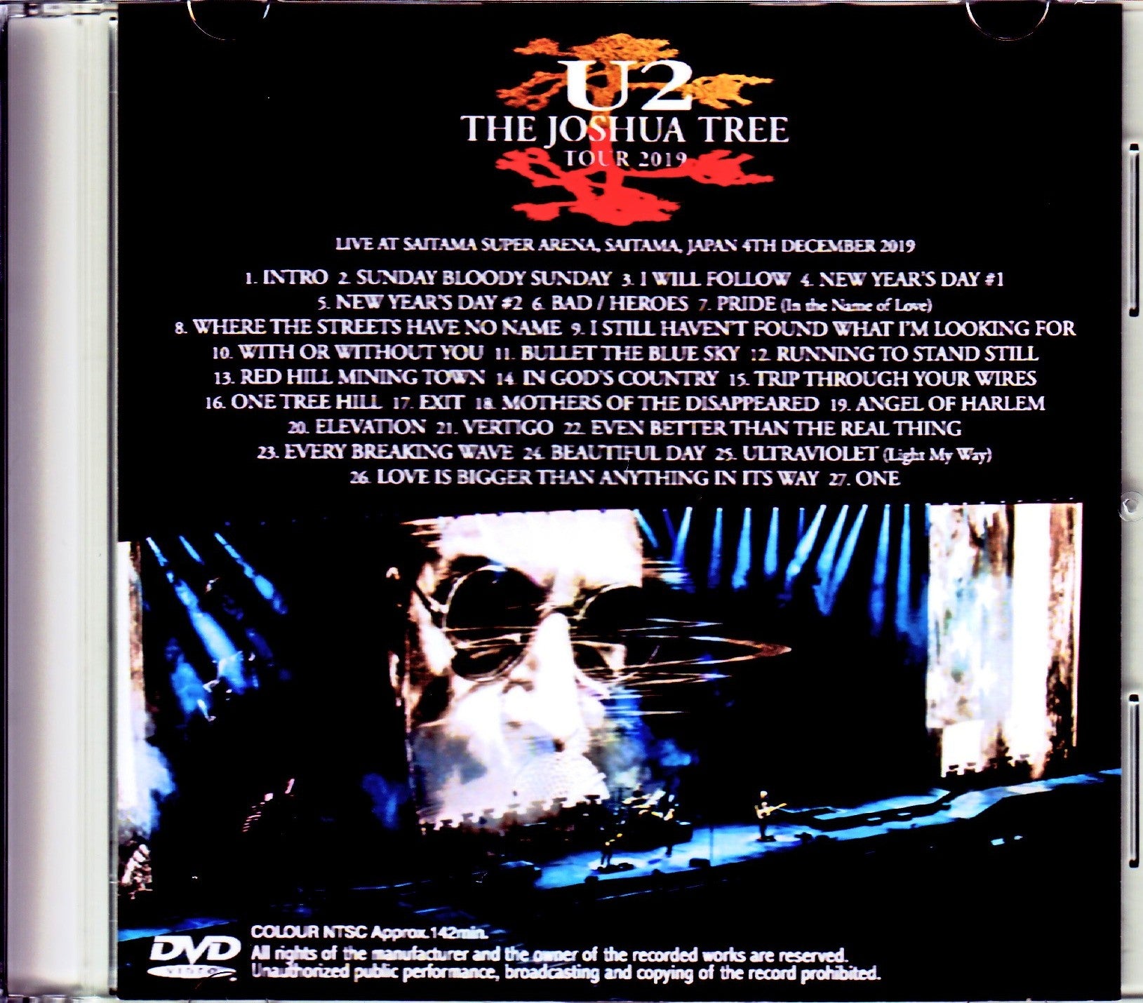 1. Intro 2. Sunday Bloody Sunday 3. I Will Follow 4. New Year's Day #1 5. New Year's Day #2 6. Bad / Heroes 7. Pride (In the Name of Love) 8. Where The Streets Have No Name 9. I Still Haven't Found What I'm Looking For 10. With Or Without You 11. Bullet The Blue Sky 12. Running To Stand Still 13. Red Hill Mining Town 14. In God's Country 15. Trip Through Your Wires 16 . One Tree Hill 17. Exit 18. Mothers Of The Disappeared 19. Angel Of Harlem 20. Elevation 21. Vertigo 22. Even Better Than The Real Thing 23. Every Breaking Wave 24. Beautiful Day 25. Ultraviolet (Light My Way) 26 . Love Is Bigger Than Anything In Its Way 27. One COLOR NTSC Approx.142min.