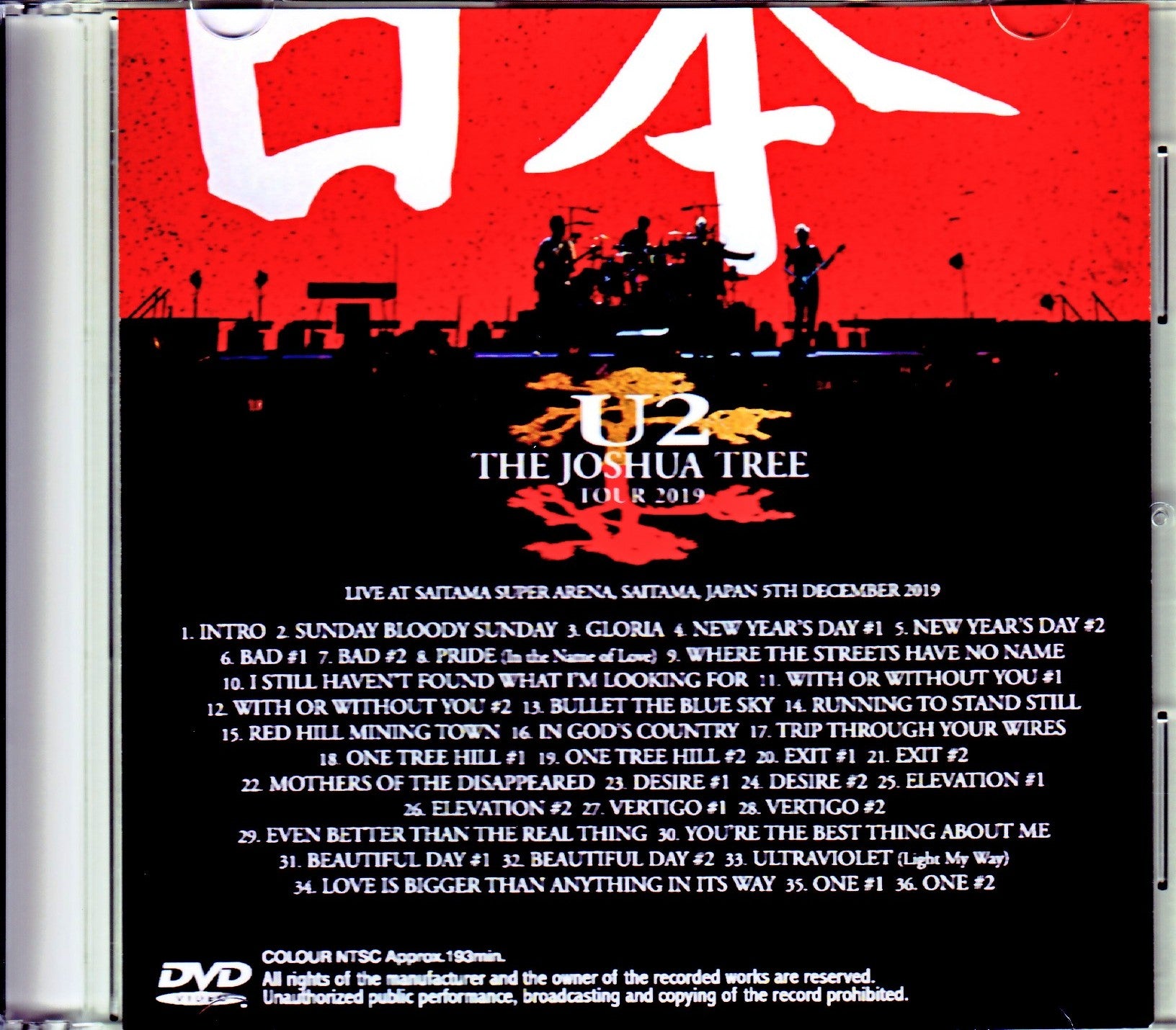 This work includes “December 5, 2019 Saitama Super Arena performance”. This is the audience shot. An "expanded version" based on the audience shot compilation "SAITAMA SUPER ARENA 2019: THE VIDEO" produced by a maniac and seamlessly re-edited. The style of assembling a full show with videos for almost each song is the same, as is the method of selecting masterpiece shots from a huge group of videos. However, the volume and quality exceed the first day's edition. The show itself had the same number of songs on the first and second days, but this work added 10 songs with different takes. With a total of 27 songs and 36 takes, you can fully enjoy the full show + α (In the previous edition, “Bullet The Blue Sky” was the first day video, but in this work it was correctly replaced on the second day) . The video quality was higher on the second day, but the additional shots were added later, so the scenery was just spectacular. There are no professional shots like on the first day, but overall this work is a huge video that is full of heart and stomach. And the super spectacle that can only be achieved through video is overwhelming. Although it is not as eccentric as “360° TOUR”, the beauty and power of the shockingly large screen is overwhelming. The close-up shots that look like professional shots are great, but the close-up shots are also amazing. Even though various angles are used, they don't fit all on the screen, and even when you follow the members as they move around the stage, you can't see the edges of the screen. Everywhere you turn, you are surrounded by beautiful images. The Japanese subtitles that appear at key points, such as bashing President Trump and calling for participation in the "ONE Campaign," are perfect. Cutting-edge video production and a super spectacle will unfold before your eyes. “December 5, 2019” will probably be the last time that a complete reproduction of “THE JOSHUA TREE” will be played in Japan. Live at Saitama Super Arena, Saitama, Japan 5th December 2019 AMAZING SHOTS!!! (192:31) 1. Intro 2. Sunday Bloody Sunday 3. Gloria 4. New Year's Day #1 5. New Year's Day #2 6. Bad #1 7. Bad #2 8. Pride (In the Name of Love) 9. Where the Streets Have No Name 10. I Still Haven't Found What I'm Looking For 11. With or Without You #1 12. With or Without You #2 13. Bullet the Blue Sky 14. Running To Stand Still 15. Red Hill Mining Town 16. In God's Country 17. Trip Through Your Wires 18. One Tree Hill #1 19. One Tree Hill #2 20. Exit #1 21. Exit #2 22. Mothers Of The Disappeared 23. Desire #1 24. Desire #2 25. Elevation #1 26. Elevation #2 27. Vertigo #1 28. Vertigo #2 29. Even Better Than The Real Thing 30. You're The Best Thing About Me 31. Beautiful Day #1 32. Beautiful Day #2 33. Ultraviolet (Light My Way) 34. Love Is Bigger Than Anything in Its Way 35. One #1 36. One #2 COLOR NTSC Approx.193min.