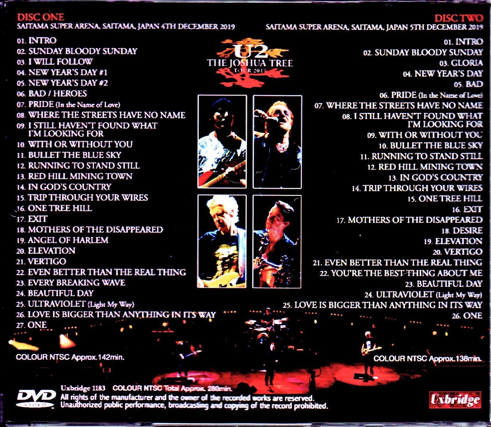 Disc 1(141:13) Live at Saitama Super Arena, Saitama, Japan 4th December 2019 1. Intro 2. Sunday Bloody Sunday 3. I Will Follow 4. New Year's Day #1 5. New Year's Day #2 6. Bad / Heroes 7. Pride (In the Name of Love) 8. Where The Streets Have No Name 9. I Still Haven't Found What I'm Looking For 10. With Or Without You 11. Bullet The Blue Sky 12. Running To Stand Still 13. Red Hill Mining Town 14. In God's Country 15. Trip Through Your Wires 16. One Tree Hill 17. Exit 18. Mothers Of The Disappeared 19. Angel Of Harlem 20. Elevation 21. Vertigo 22. Even Better Than The Real Thing 23. Every Breaking Wave 24. Beautiful Day 25. Ultraviolet (Light My Way) 26. Love Is Bigger Than Anything In Its Way 27. One Disc 2(137:57) Live at Saitama Super Arena, Saitama, Japan 5th December 2019 1. Intro 2. Sunday Bloody Sunday 3. Gloria 4. New Year's Day 5. Bad 6. Pride (In the Name of Love) 7. Where the Streets Have No Name 8. I Still Haven't Found What I'm Looking For 9. With or Without You 10. Bullet the Blue Sky 11. Running To Stand Still 12. Red Hill Mining Town 13. In God's Country 14. Trip Through Your Wires 15. One Tree Hill 16. Exit 17. Mothers Of The Disappeared 18. Desire 19. Elevation 20. Vertigo / 21. Even Better Than The Real Thing 22. You're The Best Thing About Me 23. Beautiful Day 24. Ultraviolet (Light My Way) 25. Love Is Bigger Than Anything in Its Way 26. One COLOR NTSC Approx.280min.(total)