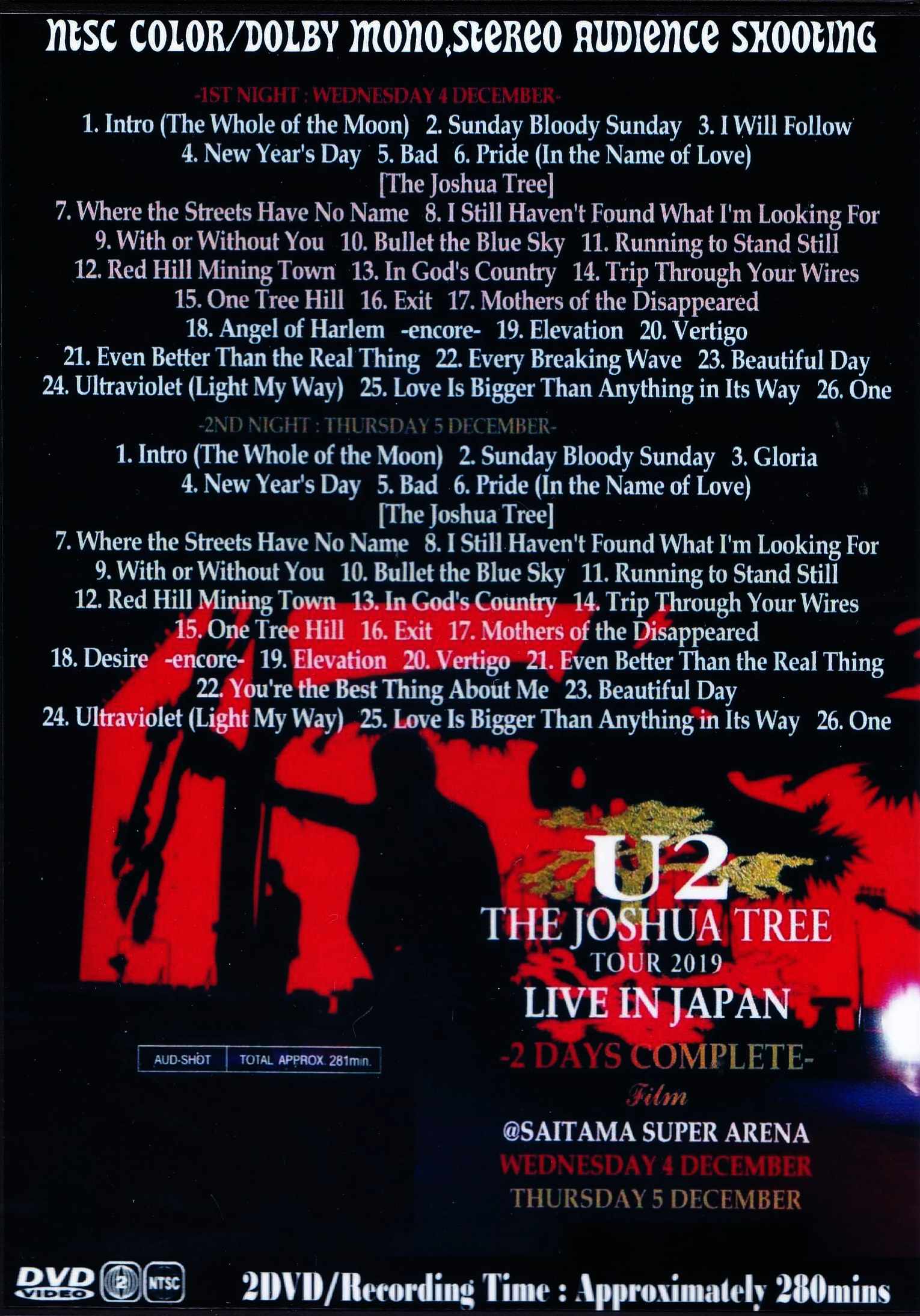 01. Intro (The Whole of the Moon) 02. Sunday Bloody Sunday 03. I Will Follow 04. New Year's Day 05. Bad 06. Pride (In the Name of Love) 07. Where the Streets Have No Name 08. I Still Haven't Found What I'm Looking For 09. With or Without You 10. Bullet the Blue Sky 11. Running to Stand Still 12. Red Hill Mining Town 13. In God's Country 14. Trip Through Your Wires 15. One Tree Hill 16. Exit 17. Mothers of the Disappeared 18. Angel of Harlem Encore: 19. Elevation 20. Vertigo 21. Even Better Than the Real Thing 22. Every Breaking Wave 23. Beautiful Day 24. Ultraviolet (Light My Way) 25. Love Is Bigger Than Anything in Its Way 26. One Saitama Super Arena, Saitama, Japan 5th December 2019 (DVD / 141min. Aud-shot) 01. Intro (The Whole of the Moon) 02. Sunday Bloody Sunday 03. Gloria 04. New Year's Day 05. Bad 06. Pride (In the Name of Love) 07. Where the Streets Have No Name 08. I Still Haven't Found What I'm Looking For 09. With or Without You 10. Bullet the Blue Sky 11 Running to Stand Still 12. Red Hill Mining Town 13. In God's Country 14. Trip Through Your Wires 15. One Tree Hill 16. Exit 17. Mothers of the Disappeared 18. Desire Encore: 19. Elevation 20. Vertigo 21. Even Better Than the Real Thing 22. You're the Best Thing About Me 23. Beautiful Day 24. Ultraviolet (Light My Way) 25. Love Is Bigger Than Anything in Its Way 26. One