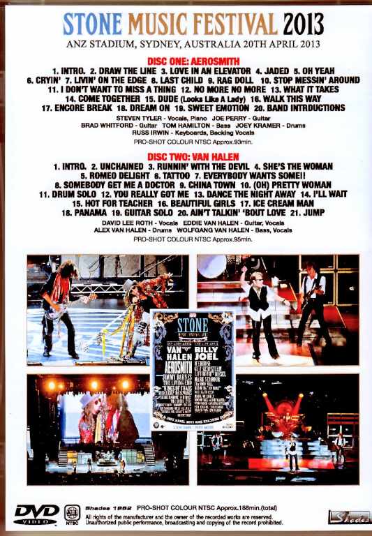 (Disc 1 : AEROSMITH) 1. Intro 2. Draw The Line 3. Love In An Elevator 4. Jaded 5. Oh Yeah 6. Cryin' 7. Livin' On The Edge 8. Last Child 9. Rag Doll 10. Stop Messin' Around 11. I Don't Want To Miss A Thing 12. No More No More 13. What It Takes 14. Come Together 15. Dude (Looks Like A Lady) 16. Walk This Way 17. Encore Break 18. Dream On 19. Sweet Emotion 20. Band Introductionsn at ANZ Stadium, Sydney, Australia 20th April 2013 : PRO-SHOT COLOUR NTSC Approx.93min (Disc 2 : VAN HALEN) 1. Intro 2. Unchained 3. Runnin' With The Devil 4.. She's The Woman 5. Romeo Delight 6. Tattoo 7. Everybody Wants Some!! 8. Somebody Get Me A Doctor 9. China Town 10. (Oh) Pretty Woman 11. Drum Solo 12. You Really Got Me 13. Dance The Night Away 14. I'll Wait 15. Hot For Teacher 16. Beautiful Girls 17. Ice Cream Man 18. Panama 19. Guitar Solo 20. Ain't Talkin' Bout Love 21. Jump at ANZ Stadium, Sydney, Australia 20th April 2013 : PRO-SHOT COLOUR NTSC Approx.95min