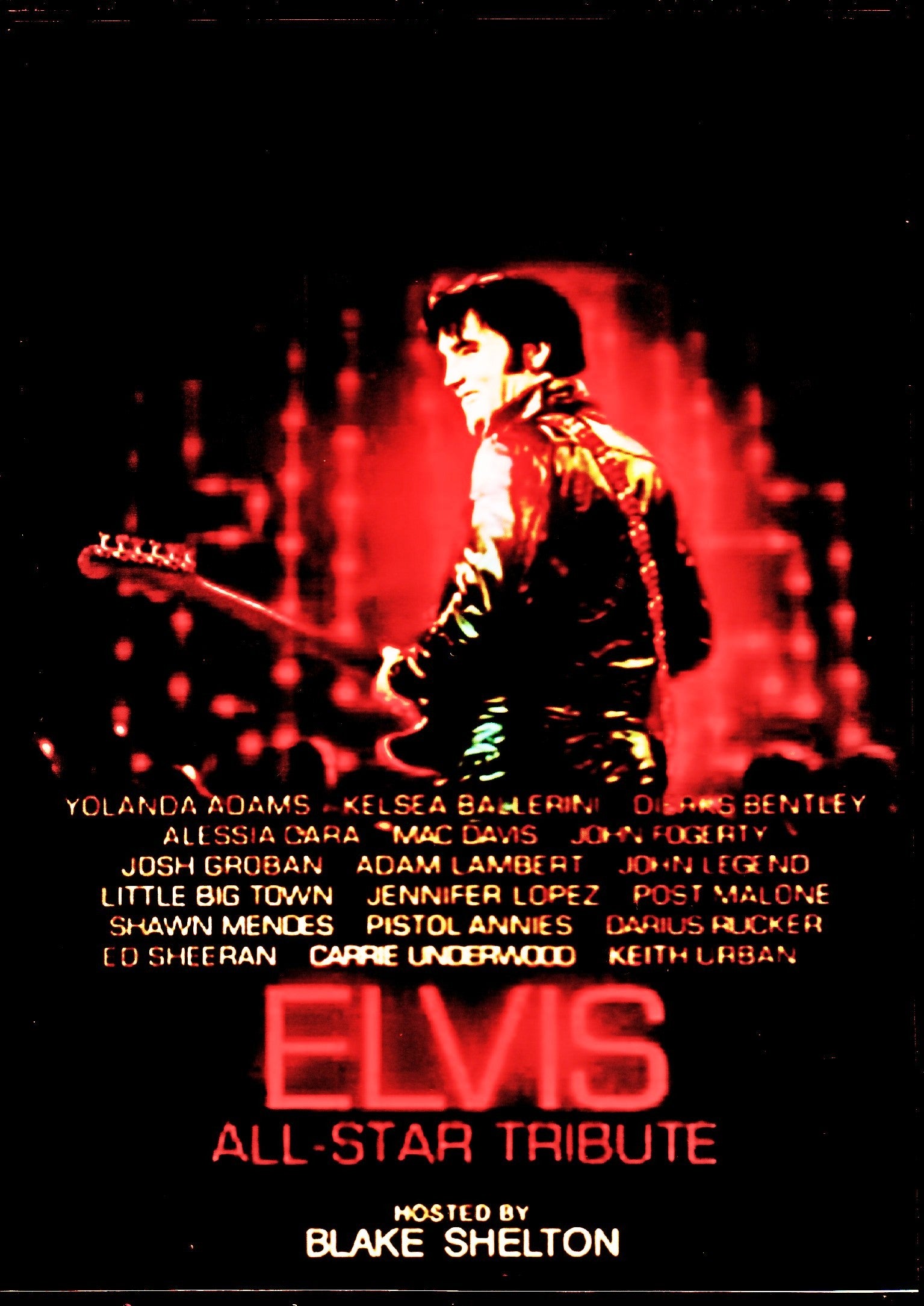 To commemorate the 50th anniversary of Elvis Presley's 1968 broadcast of "Singer Presents...Elvis (68 Comeback Special)," "Elvis All-" was recorded at Universal Studios in October 2018 and aired in February 2019. This is a video recording of "Star Tribute". Blake Shelton served as MC and featured artists from a variety of genres including Jennifer Lopez, John Legend, Ed Sheeran, Post Malone, Adam Lambert, Shawn Mendes, Alessia Cara, Keith Urban, and Carrie Underwood. Cover of Elvis's famous song. *Universal Studios, Universal City, CA October 10 2018 aired February 17 2019 01.Trouble/Guitar Man - Elvis Presley 02.Introduction 03.Hound Dog - Shawn Mendes 04.Burning Love - Keith Urban 05.Baby, What You Want Me To Do - Keith Urban & Post Malone 06. Jailhouse Rock - John Fogerty 07. Can't Help Falling In Love - Ed Sheeran 08. Always On My Mind - Kelsea Ballerini 09. Heartbreak Hotel - Jennifer Lopez 10. One Night - Darius Rucker 11 .Suspicious Minds - Blake Shelton 12.Love Me Tender - Alessia Cara 13.Memories - Mac Davis 14.A Little Less Conversation - John Legend 15.Are You Lonesome Tonight - Little Big Town 16.Blue Suede Shoes - Adam Lambert 17.Love Me - Pistol Annies 18.Hits medley : That's All Right/Don't Be Cruel/Blue Suede Shoes - Mac Davis, Post Malone, Little Big Town, Darius Rucker & Blake Shelton 19.Gospel medley : How Great Thou Art/He Touched Me/You'll Never Walk Alone - Carrie Underwood & Yolanda Adams 20.Little Sister - Dierks Bentley 21.It's Now Or Never - Josh Groban 22.If I Can Dream - Elvis Presley, Carrie Underwood, Shawn Mendes, Post Malone, Darius Rucker, Blake Shelton (75 minutes)