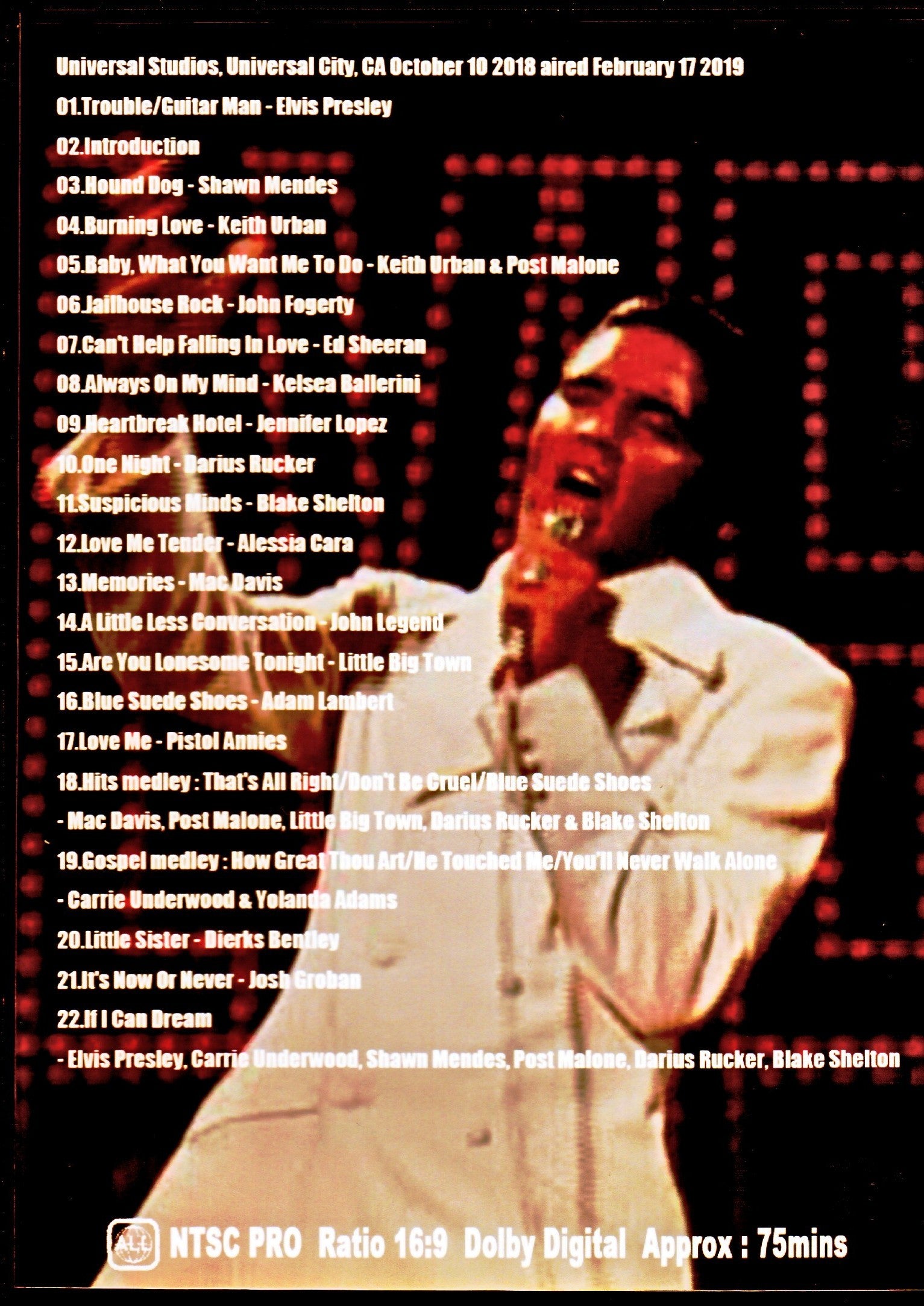 01.Trouble/Guitar Man - Elvis Presley 02.Introduction 03.Hound Dog - Shawn Mendes 04.Burning Love - Keith Urban 05.Baby, What You Want Me To Do - Keith Urban & Post Malone 06.Jailhouse Rock - John Fogerty 07 .Can't Help Falling In Love - Ed Sheeran 08.Always On My Mind - Kelsea Ballerini 09.Heartbreak Hotel - Jennifer Lopez 10.One Night - Darius Rucker 11.Suspicious Minds - Blake Shelton 12.Love Me Tender - Alessia Cara 13 .Memories - Mac Davis 14.A Little Less Conversation - John Legend 15.Are You Lonesome Tonight - Little Big Town 16.Blue Suede Shoes - Adam Lambert 17.Love Me - Pistol Annies 18.Hits medley: That's All Right/Don' t Be Cruel/Blue Suede Shoes - Mac Davis, Post Malone, Little Big Town, Darius Rucker & Blake Shelton 19. Gospel medley : How Great Thou Art/He Touched Me/You'll Never Walk Alone - Carrie Underwood & Yolanda Adams 20 .Little Sister - Dierks Bentley 21.It's Now Or Never - Josh Groban 22.If I Can Dream - Elvis Presley, Carrie Underwood, Shawn Mendes, Post Malone, Darius Rucker, Blake Shelton (75 minutes)