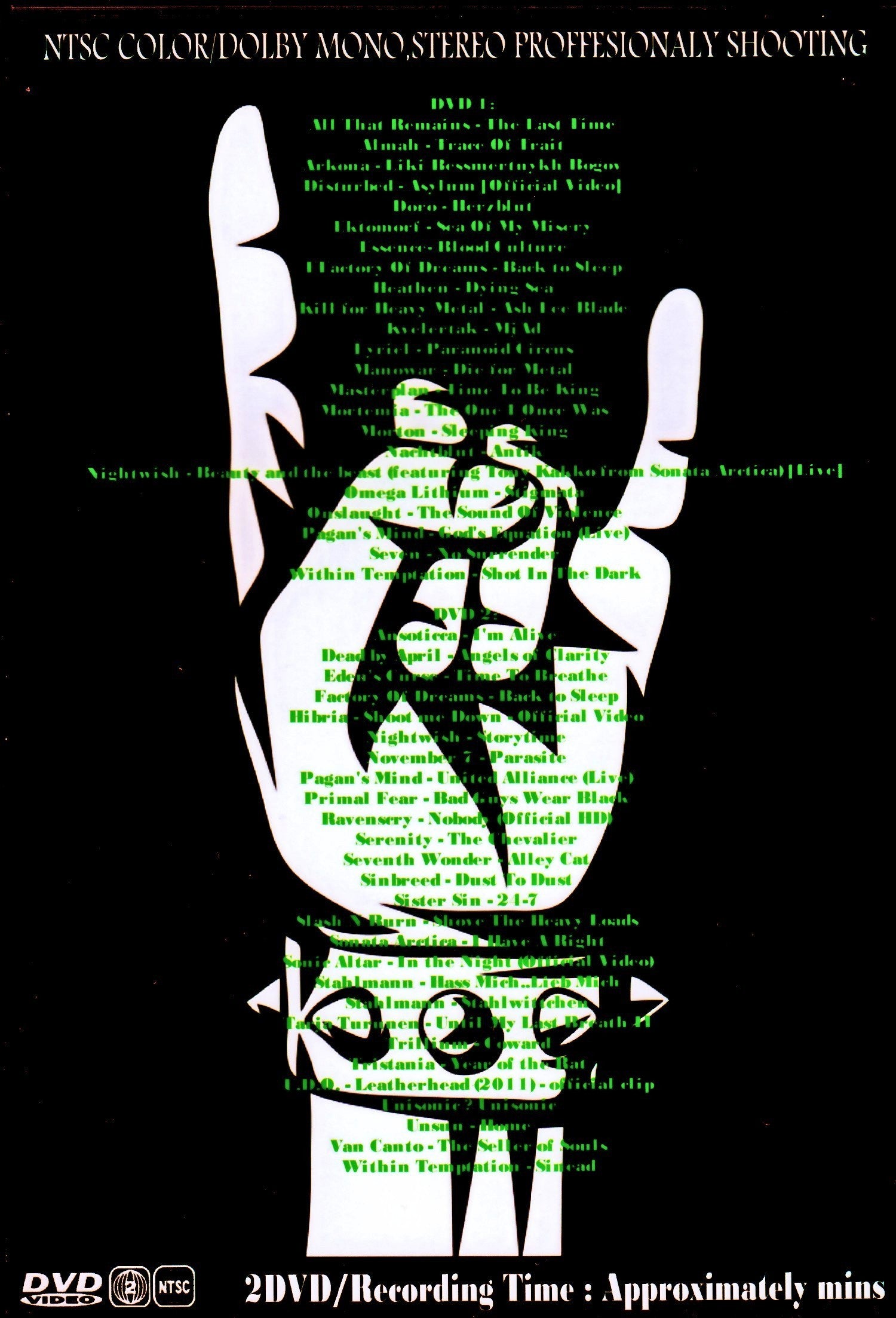 Disc 1: All That Remains - The Last Time Almah - Trace Of Trait Arkona - Liki Bessmertnykh Bogov Disturbed - Asylum [Official Video] Doro - Herzblut Ektomorf - Sea Of My Misery Essence- Blood Culture FFactory Of Dreams - Back to Sleep Heathen - Dying Sea Kill for Heavy Metal - Ash Lee Blade Kvelertak - MjÃd Lyriel - Paranoid Circus Manowar - Die for Metal Masterplan - Time To Be King Mortemia - The One I Once Was Morton - Sleeping King Nachtblut - Antik Nightwish - Beauty and the beast (featuring Tony Kakko from Sonata Arctica) [Live] Omega Lithium - Stigmata Onslaught - The Sound Of Violence Pagan's Mind - God's Equation (Live) Seven - No Surrender Within Temptation - Shot In The Dark Disc 2: Ansoticca - I'm Alive Dead by April - Angels of Clarity Eden's Curse - Time To Breathe Factory Of Dreams - Back to Sleep Hibria - Shoot me Down - Official Video Nightwish - Storytime November 7 - Parasite Pagan's Mind - United Alliance (Live) Primal Fear - Bad Guys Wear Black Ravenscry - Nobody ( Official HD) Serenity - The Chevalier Seventh Wonder - Alley Cat Sinbreed - Dust To Dust Sister Sin - 24-7 Slash N Burn - Shove The Heavy Loads Sonata Arctica - I Have A Right Sonic Altar - In the Night (Official Video) Stahlmann - Hass Mich..Lieb Mich Stahlmann - Stahlwittchen Tarja Turunen - Until My Last Breath II Trillium - Coward Tristania - Year of the Rat U.D.O. - Leatherhead (2011) - official clip Unisonic – Unisonic Unsun - Home Van Canto - The Seller of Souls Within Temptation - Sinéad DVD Format: NTSC Source: professional Shot (Multi-Camera) Video Quality: Rating: 9.0 Menus: Yes Chapter Selection: Yes Total Running Time: 23 Videos