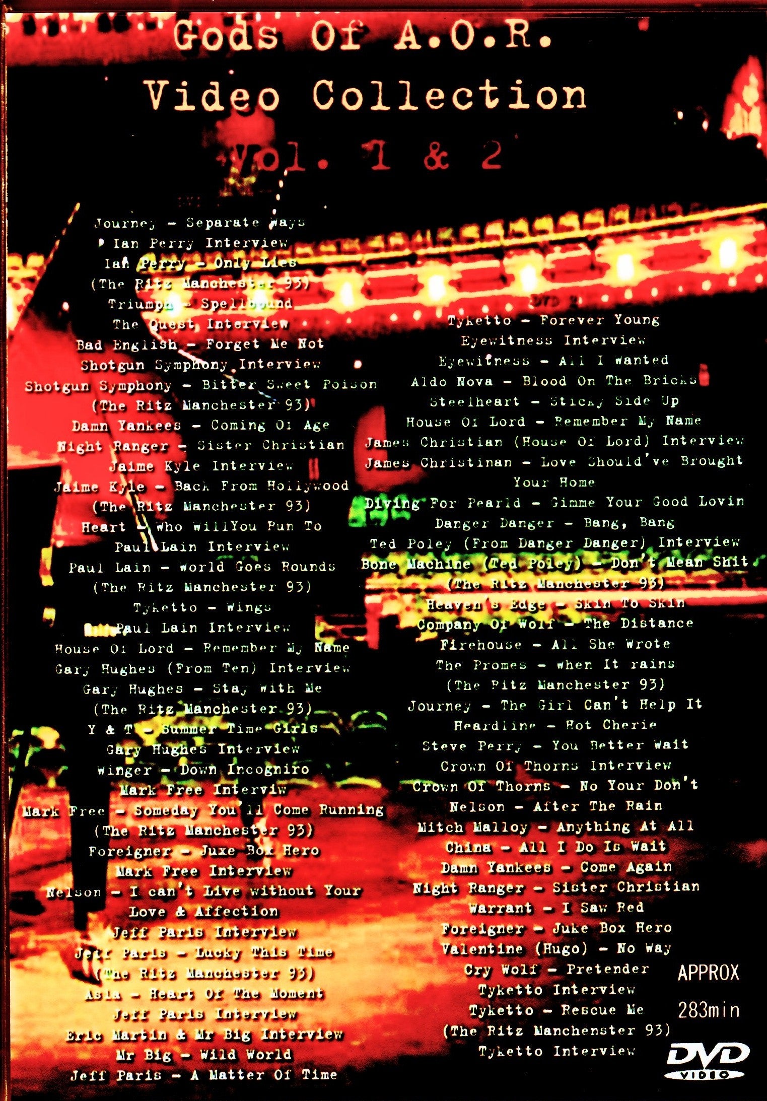 Disc 1 Journey - Separate Ways Ian Perry Interview Ian Perry? Only Lies (The Ritz Manchester 93) Triumph Spellbound The Quest Interview Bad English Forget Me Not Shotgun Symphony Interview Shotgun Symphony Bitter Sweet Poison (The Ritz Manchester 93) Damn Yankees Coming Of Age Night Ranger Sister Christian Jaime Kyle Interview Jaime Kyle Back From Hollywood (The Ritz Manchester 93) Heart Who WillYou Run To Paul Lain Interview Paul Lain World Goes Rounds (The Ritz Manchester 93) Tyketto Wings Paul Lain Interview House Of Lord Remember My Name Gary Hughes ( From Ten) Interview Gary Hughes Stay With Me (The Ritz Manchester 93) Y & T Summer Time Girls Gary Hughes Interview Winger - Down Incogniro Mark Free Interviw Mark Free Someday You'll Come Running (The Ritz Manchester 93) Foreigner Juxe Box Hero Mark Free Interview Nelson I can't Live without Your Love & Affection Jeff Paris Interview Jeff Paris - Lucky This Time (The Ritz Manchester 93) Asia Heart Of The Moment Jeff Paris Interview Eric Martin & Mr Big Interview Mr Big Wild World Jeff Paris A Matter Of Time Disc 2 Tyketto Forever Young Eyewitness Interview Eyewitness All I Wanted Aldo Nova Blood On The Bricks Steelheart Sticky Side Up House Of Lord Remember My Name James Christian (House Of Lord) Interview James Christinan Love Should've Brought Your Home Diving For Pearld Gimme Your Good Lovin Danger Danger Bang, Bang Ted Poley (From Danger Danger) Interview Bone Machine (Ted Poley) Don't Mean Shit (The Ritz Manchester 93) Heaven's Edge Skin To Skin Company Of Wolf The Distance Firehouse All She Wrote The Promes When It rains (The Ritz Manchester 93) Journey The Girl Can't Help It Heardline Hot Cherie Steve Perry You Better Wait Crown Of Thorns Interview Crown Of Thorns Interview Crown Of Thorns No Your Don't Nelson After The Rain Mitch Malloy Anything At All China All I Do Is Wait Damn Yankees Come Again Night Ranger Sister Christian Warrant I Saw Red Foreigner Juke Box Hero Valentine (Hugo) No Way Cry Wolf Pretender Tyketto Interview Tyketto Rescue Me (The Ritz Manchenster 93) Tyketto Interview