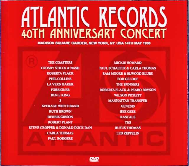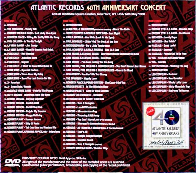 [Live at Madison Square Garden, New York, NY. USA 14th May 1988 : PRO-SHOT COLOUR NTSC Approx.343min] Disc 1 : 1. Opening 2. The Coasters - Yakety Yak 3. Crosby Stills & Nash - Suit:Judy Blue Eyes 4. Roberta Flack - Killing Me Softly With His Song 5. Phil Collins - In The Air Tonight 6. La Vern Baker - Jim Dandy 7. La Vern Baker - Used To Smoke And Drink 8. Foreigner - Hot Blooded 9. Foreigner - Juke Box Hero 10. Foreigner – Urgent 11. Foreigner - I Want To Know What Love Is 12. Ben E King - Spanish Harlem 13. Ben E King - There Goes My Baby 14. Ben E King - Save The Last Dance For Me 15. 3 – America 16. 3 - Drum Solo/Rondo 17. Average White Band - Pick Up The Pieces 18. Ruth Brown - Teardrops From My Eyes 19. Debbie Gibson - Staying Together 20. Debbie Gibson - Foolish Beat 21. Debbie Gibson - Out Of The Blue 22. Debbie Gibson - Only In My Dreams 23. Debbie Gibson - Happy Birthday 24. Robert Plant - Heaven Knows 25. Robert Plant - Ship Of Fools 26. Robert Plant - Tall Cool One incl Custard Pie 27. Robert Plant, Carmine Appice, etc - Interviews Disc 2 : 1. Intro. 2. Alan Paul & Tim Hauser (Manhattan Transfer) - Mack The Knife 3. Steve Cropper & Donald Duck Dan - Last Night 4. Carla Thomas - Gee Whiz (Look At his Eyes) 5. Paul Rodgers - (Sittin' On) The Dock of the Bay 6. Mickie Howard - Try a Little Tenderness 7. Paul Schaefer & Carla Thomas - Son Of A Gun 8. Sam Moore & Elwood Blues - Everybody Needs Somebody To Love 9. Sam Moore & Elwood Blues - Soul Man 10. Sam Moore - I've been Loving You Too Long 11. Sam Moore, Phil Collins & Elwood Blues - You Don't Know Like I Know 12. Sam Moore, Phil Collins & Elwood Blues - Knock On Wood 13. Bob Geldof - You Can't Be Too Strong 14. The Spinners - Mighty Love 15. Roberta Flack & Peabo Bryson - The Coser I Get You 16. Wilson Pickett - In The Midnight Hour 17. Wilson Pickett - Land Of 1000 Dances 18. Manhattan Transfer – Birdland 19. Introduction of Ahmet Ertegun 20. Genesis - Turn It On Again 21. Genesis - Land Of Confusion 22. Genesis – Misunderstanding 23. Genesis - Throwing It All Away 24. Genesis - You Can`t Hurry Love (Phill Collins) 25. Genesis - Shortcut To Somewhere (Tony Banks) 26. Genesis - All I Need Is A Miracle (Mike & The Mechanics) 27. Genesis - That's All 28. Genesis - Tonight Tonight Tonight 29. Genesis - Invisible Touch 30. Genesis - Turn It On Again(reprise) 31. Crosby Stills & Nash - Wodden Ship Disc 3 : 1. Introduction 2. Crosby Stills & Nash - Wooden Ship 3. Crosby Stills & Nash - Our House 4. Bee Gees - Lonely Days 5. Bee Gees - Jive Talkin' 6. Rascals - Good Lovin' 7. Rascals - Groovin' 8. Rascals - People Got To Be Free 9. Yes - I've Seen All Good People 10. Yes - Hold On 11. Rufus Thomas - Walking The Dog 12. Introduction 13. Led Zeppelin – Kashmir 14. Led Zeppelin – Heartbreaker 15. Led Zeppelin - Whole Lotta Love 16. Led Zeppelin - Misty Mountain Hop 17. Led Zeppelin - Stairway To Heaven
