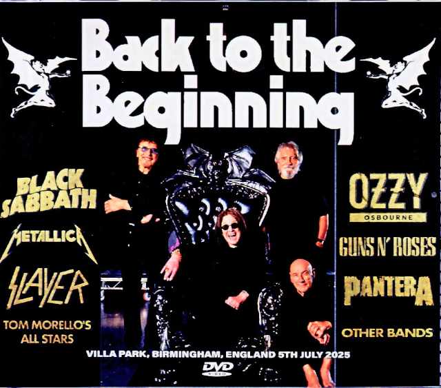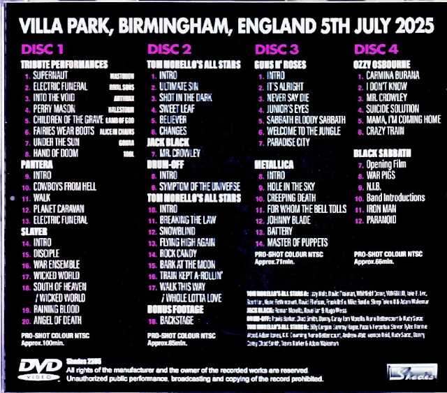 Villa Park, Birmingham, England 5th July 2025 PRO-SHOT DISC 1 TRIBUTE PERFORMANCES 1. Supernaut / MASTODON 2. Electric Funeral / RIVAL SONS 3. Into The Void / ANTHRAX 4. Perry Mason / HALESTORM 5. Children Of The Grave / LAMB OF GOD 6. Fairies Wear Boots / ALICE IN CHAINS 7. Under The Sun / GOJIRA 8. Hand Of Doom / TOOL PANTERA 9. Intro 10. Cowboys From Hell 11. Walk 12. Planet Caravan 13. Electric Funeral SLAYER 14. Intro 15. Disciple 16. War Ensemble 17. Wicked World 18. South Of Heaven/Wicked World 19. Raining Blood 20. Angel Of Death PRO-SHOT COLOUR NTSC Approx.100min. DISC 2 TOM MORELLO'S ALL STARS 1. Intro 2. Ultimate Sin (Lzzy Hale, Jake E. Lee, David Ellefson, Adam Wakeman, Nuno Bettencourt & Mike Bordin) 3. Shot in the Dark (David Draiman, Jake E. Lee, David Ellefson, Adam Wakeman, Nuno Bettencourt & Mike Bordin) 4. Sweet Leaf (David Draiman, Scott Ian, David Ellefson, Adam Wakeman, Nuno Bettencourt & Mike Bordin) 5. Believer (Whitfield Crane, Scott Ian, Frank Bello, Sleep Token II & Adam Wakeman) 6.Changes (YUNGBLUD, Nuno Bettencourt, Frank Bellow, Sleep Token II & Adam Wakeman) JACK BLACK 7. Mr. Crowley (Featuring Roman Morello, Revel Ian & Hugo Weiss) DRUM-OFF 8. Intro 9. Symptom Of The Universe (Travis Barker, Chad Smith, Danny Carey with Tom Morello, Nuno Bettencourt & Rudy Sarzo) TOM MORELLO'S ALL STARS 10. Intro 11. Breaking the Law (Billy Corgan, Tom Morello, Adam Jones, K.K. Downing, Rudy Sarzo & Danny Carey 12. Snowblind (Billy Corgan, Tom Morello, Adam Jones, K.K. Downing, Rudy Sarzo & Danny Carey) 13. Flying High Again (Sammy Hagar, Nuno Bettencourt, Vernon Reid, Adam Wakeman, Rudy Sarzo & Chad Smith) 14. Rock Candy (Sammy Hagar, Nuno Bettencourt, Adam Wakeman, Rudy Sarzo, Chad Smith & Tom Morello) 15. Bark at the Moon (Papa V Perpetua, Vernon Reid, Nuno Bettencourt, Adam Wakeman, Rudy Sarzo & Travis Barker) 16. Train Kept A-Rollin' (Steven Tyler, Ronnie Wood, Nuno Bettencourt, Tom Morello, Andrew Watt, Rudy Sarzo & Travis Barker) 17. Walk This Way / Whole Lotta Lov BONUS FOOTAGE 18. Backstage PRO-SHOT COLOR NTSC Approx.85min. Disc 3 GUNS N' ROSES 1. Intro 2. It's Alright 3. Never Say Die 4. Junior's Eyes 5. Sabbath Bloody Sabbath 6. Welcome To The Jungle 7. Paradise City METALLICA 8. Intro 9. Hole In The Sky 10. Creeping Death 11. For Whom The Bell Tolls 12. Johnny Blade 13. Battery 14. Master Of Puppets PRO-SHOT COLOUR NTSC Approx.71min. Disc 4 OZZY OSBOURNE 1. Carl Orff "Carmina Burana" 2. I Don't Know 3. Mr. Crowley 4. Suicide Solution 5. Mama, I'm Coming Home 6. Crazy Train BLACK SABBATH 7. Sabbra Cadabra (Opening Film) 8. War Pigs 9. N.I.B. 10. Band Introductions 11. Iron Man 12. Paranoid PRO-SHOT COLOR NTSC Approx.66min.