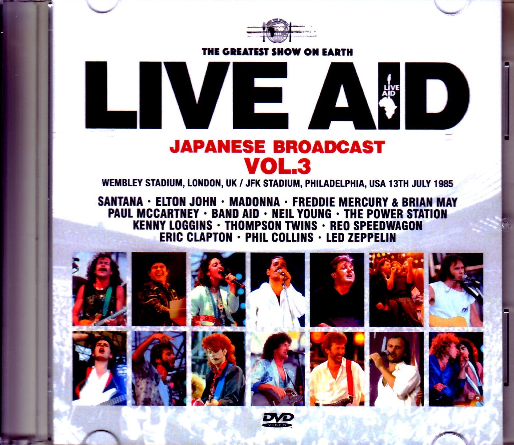 ``LIVE AID'' is the biggest event of the 20th century...no, the biggest event in the history of human music. The best pro shot that vividly revives that day that colored the summer of 1985 has been decided to be released. This work is the third installment in which you can re-experience SANTANA, when the sky was turning white, to the reunion of LED ZEPPELIN, which was the highlight. We have introduced many professional shots of “LIVE AID” so far, but this work is different. This event was broadcast live all over the world, but this work is the Japanese broadcast version. This work is the third installment. However, it is not a complete broadcast. The main broadcast was a long one, lasting about 16 hours, but this work is a selection of only "Western music" from that time. CMs inserted directly into the show, chatting with talent in the station's studio, Japanese musicians on stage, etc. are eliminated as much as possible (although you can see some members of the Heisei Board of Education). The scene where I thought at the time, ``Okay, let's show a live performance with outside sauce!'' has been removed, and now we can look back on that hot day with only delicious scenes. The biggest point of this work is the reality of "July 13, 1985", and the quality of depicting it is also superb. At our store, we have archived a number of music programs with the super best masters provided by domestic record enthusiasts, and this work is also the latest. Since then, this maniac has pursued high-end equipment and environment, and is a real man who pays close attention to the state of preservation of his masters. Its quality has been proven in many masterpiece programs, but this work is one of the special ones. Currently, recording masters of “LIVE AID” have been reported from all over the world, but the quality of this work is outstanding. Despite the era when there is no digital broadcasting, it is a visual beauty that even comes close to the official DVD. [The third part of the morning, which also featured the reunion of LED ZEPPELIN] Now that we've covered the basics, let's get down to business. This is already too wonderful. This work is the third of a total of four works, and contains 14 groups, the most in this series. Individually, I think many people choose their favorite band/musician. Let's briefly summarize the contents of this work. ★4:21/SANTANA (with Pat Metheny)○4:50/Elton John★5:27/Madonna○5:48/Freddie Mercury & Brian May○5:51/Paul McCartney○5:57 /BAND AID ★7:06/Neil Young★7:42/THE POWER STATION ★6:30/Kenny Loggins★8:21/THOMPSON TWINS ★23:47/REO SPEEDWAGON ★8:38/Eric Clapton★ 9:00/Phil Collins★9:10/LED ZEPPELIN *Note: "○" is Wembley Stadium in the UK, "★" is JFK Stadium in the US. The numbers are the start times (Japan time). ...and it looks like this. As you know, ``LIVE AID'' is held simultaneously at two locations: ``Wembley Stadium in the UK'' and ``JFK Stadium in the US'', and the event is broadcast live while being mixed up. The times listed above are the start timings of each band/artist converted to Japan time. As you can see, this third installment is recorded from after 4 o'clock, when the night was about to end, to around 9 o'clock in the morning. The main thing here is the highlights of Wembley Stadium in England. It carefully broadcasts everything from Freddie Mercury and Brian May to Paul McCartney and the final performance of BAND AID. After that, it will focus on JFK Stadium in the US, but Kenny Loggins and REO SPEEDWAGON, which could not be broadcast during the UK highlight time, will be inserted. In addition to such British highlights, this work also includes many songs that cannot be seen on the official DVD. Elton John's "I'm Still Standing" and "Can I Get a Witness," George Michael's amazing "Don't Let the Sun Go Down on Me," and Madonna's "Love Makes the World Go Round." The places are delicious, but SANTANA and THE POWER STATION are precious because they are cut whole. And above all, the reunion LED ZEPPELIN! That feeling of holding your breath, the shock of being overwhelmed (in many ways) by the performance, and the feeling of despair when the broadcast failed during the intro to "Stairway to Heaven"...it was exactly like July 1985. Because it's a Japanese broadcast, you can feel the real-time feeling ★ Neil Young's stage performance is also a highlight. Being in the middle of the country route, the large stage with the backing band International Harvesters at the time was perfect for LIVE AID. Unlike the CSN&Y stage at night, his performances during the day are very well-received, and his performances are truly heart-warming. However, in the Japanese broadcast version, there was a problem where the last two songs, "Powderfinger" and the unreleased song "Nothing Is Perfect" were not broadcast. Looking back on it now, I was very dissatisfied with the broadcast, but in Japan at the time Neil Young had a strong image of a person from the past, and I was rather satisfied with the broadcast of the famous song ``Helpless'' played and sung. I'm sure there were many fans who did. And the simultaneous translation in this work is amazing. As expected, it was the female interpreter who showed off her professional skills, and in Pette Midler's introduction, she brilliantly ignored the sarcasm about the star Madonna, ``Why do I have to introduce this girl?'' She naturally speaks words such as ``Virgin'' that men would hesitate to use. In addition, Madonna herself delivers a refreshing and moving MC without hesitation. Let's transcribe it a bit. "Let me take this opportunity to thank you all. As you all know, today's concert is full of stars performing. But the important thing, I think, is that you It's not about who you are, it's about why you're here. I'm so glad you're all here. Can you all hear me? Who's here after 33 years? A wonderful MC that pierces my heart, even though I was always focused on who was co-starring with whom. S