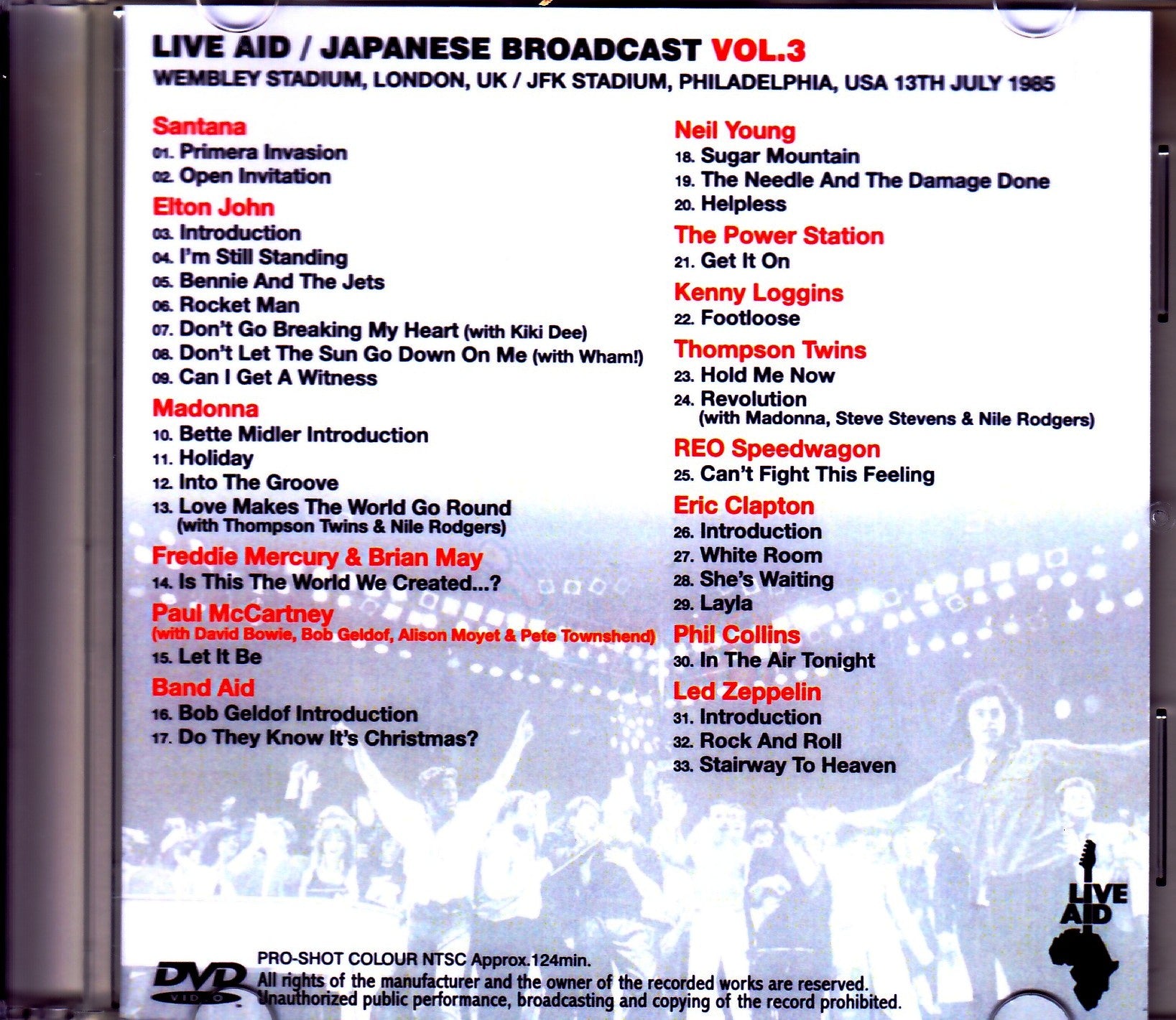 1. Primera Invasion 2. Open Invitation Elton John 3. Introduction 4. I'm Still Standing 5. Bennie and the Jets 6. Rocket Man Member Introduction Translation is waived 7. Don't Go Breaking My Heart (with Kiki Dee) 8. Don't Let the Sun Go Down on Me (with Wham!) 9. Can I Get a Witness Madonna 10. Bette Midler Introduction 11. Holiday 12. Into the Groove 13. Love Makes the World Go Round (with Thompson Twins & Nile Rodgers) Freddie Mercury & Brian May ★Freddie is spelled differently "FREDIE" 14. Is This the World We Created...? Mixed lines Paul McCartney (with David Bowie, Bob Geldof, Alison Moyet & Pete Townshend ) 15. Let It Be Mic Off Band Aid 16. Bob Geldof Introduction 17. Do They Know It's Christmas? Neil Young 18. Sugar Mountain 19. The Needle and the Damage Done 20. Helpless The Power Station 21. Get It On Kenny Loggins 22 Footloose Thompson Twins 23. Hold Me Now 24. Revolution (with Madonna, Steve Stevens & Nile Rodgers) REO Speedwagon 25. Can't Fight This Feeling Eric Clapton 26. Introduction From the introduction of two foreign women, the Japanese studio is also shown 27. White Room 28. She's Waiting 29. Layla Phil Collins 30. In the Air Tonight Led Zeppelin 31. Introduction 32. Rock and Roll 33. Stairway to Heaven