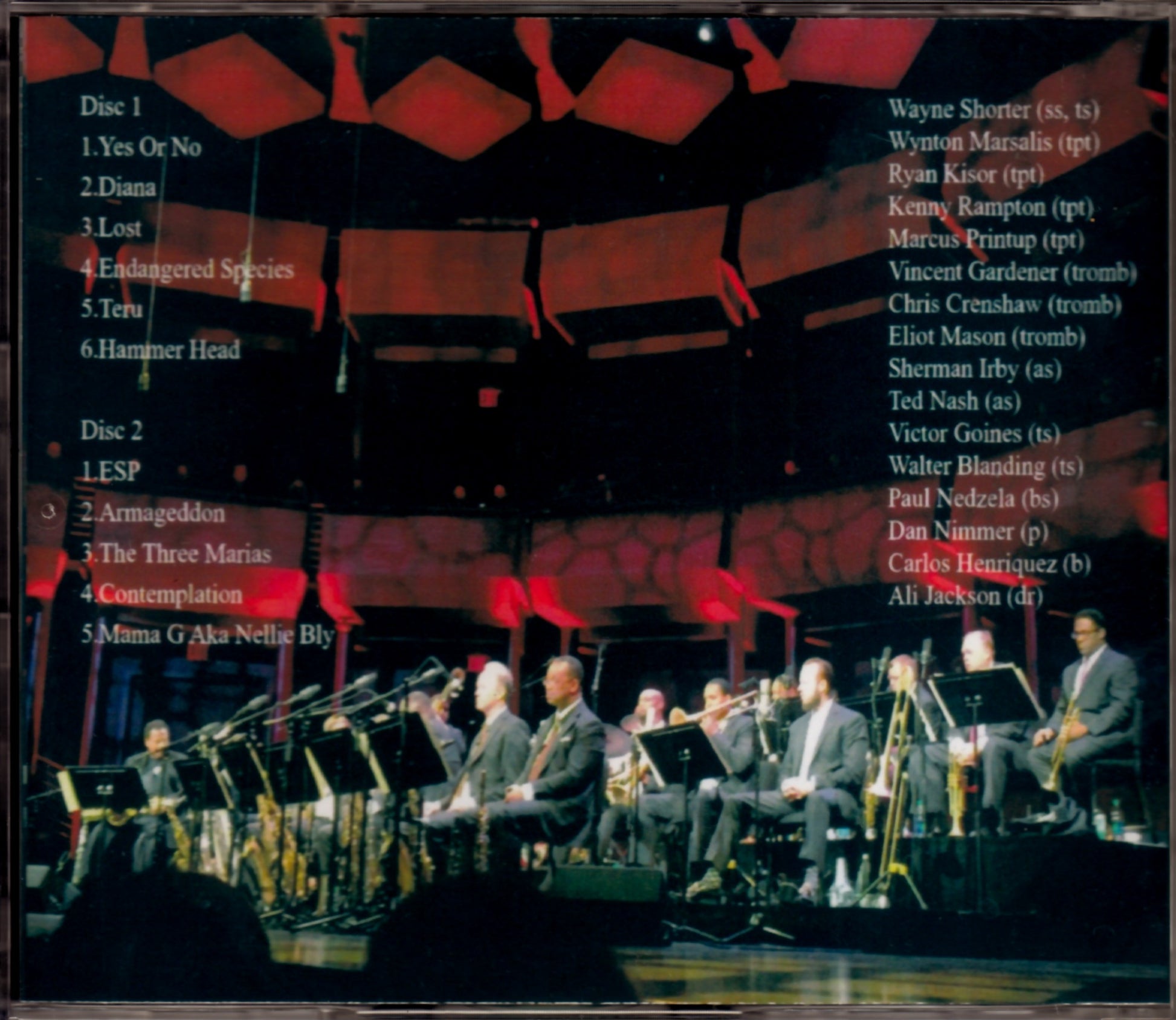 Disc 1 1.Yes Or No 2.Diana 3.Lost 4.Endangered Species 5.Teru 6.Hammer Head Disc 2 1.E.S.P 2.Armageddon 3.The Three Marias 4.Contemplation 5.Mama G Aka Nellie Bly Wayne Shorter( ss, ts) Wynton Marsalis(tpt) Ryan Kisor(tpt) Kenny Rampton(tpt) Marcus Printup(tpt) Vincent Gardener(tromb) Chris Crenshaw(tromb) Eliot Mason(tromb) Sherman Irby(as) Ted Nash(as) Victor Goines(ts) Walter Blanding(ts) Paul Nedzela(bs) Dan Nimmer(p) Carlos Henriquez(b) Ali Jackson(dr)