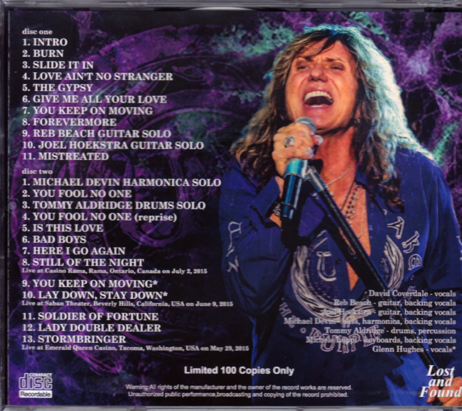 disc one: 1. INTRO/2. BURN/3. SLIDE IT IN/4. LOVE AIN'T NO STRANGER/5. THE GYPSY/6. GIVE ME ALL YOUR LOVE/7. YOU KEEP ON MOVING/8. FOREVERMORE/ 9. REB BEACH GUITAR SOLO/10. JOEL HOEKSTRA GUITAR SOLO/11. MISTREATED disc two : 1. MICHAEL DEVIN HARMONICA SOLO/2. YOU FOOL NO ONE/3. TOMMY ALDRIDGE DRUMS SOLO/4. YOU FOOL NO ONE (reprise) /5. IS THIS LOVE/6. BAD BOYS/7. HERE I GO AGAIN/8. STILL OF THE NIGHT [Live at Casino Rama, Rama, Ontario, Canada July 2nd 2015] 9. YOU KEEP ON MOVING/10. LAY DOWN, STAY DOWN [Live at Saban Theater, Beverly Hills, California, USA June 9th 2015 with Glenn Hughes] 11. SOLDIER OF FORTUNE/12. LADY DOUBLE DEALER/13. STORMBRINGER [Live at Emerald Queen Casino, Tacoma, Washington, USA May 29th 2015]