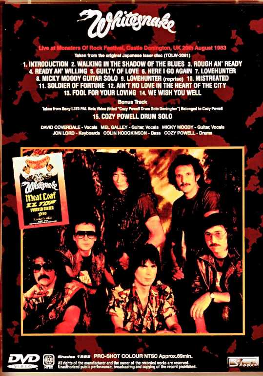 Live at Monsters Of Rock Festival, Castle Donington, UK 20th August 1983 PRO-SHOT Taken from the original Japanese laser disc(TOLW-3061) (68:50) 1. Introduction 2. Walking In The Shadow Of The Blues 3. Rough An' Ready 4. Ready An' Willing 5. Guilty Of Love 6. Here I Go Again 7. Lovehunter 8. Micky Moody Guitar Solo 9. Lovehunter (reprise) 10. Mistreated 11. Soldier Of Fortune 12. Ain't No Love In The Heart Of The City 13. Fool For Your Loving 14. We Wish You Well Bonus Track Taken from Sony L350 PAL Beta Video (titled "Cozy Powell Drum Solo Donington") Belonged to Cozy Powell 15. Cozy Powell Drum Solo David Coverdale - Vocals Mel Galley - Guitar, Vocals Micky Moody - Guitar, Vocals Jon Lord - Keyboards Colin Hodgkinson - Bass Cozy Powell - Drums PRO-SHOT COLOUR NTSC Approx.69min.