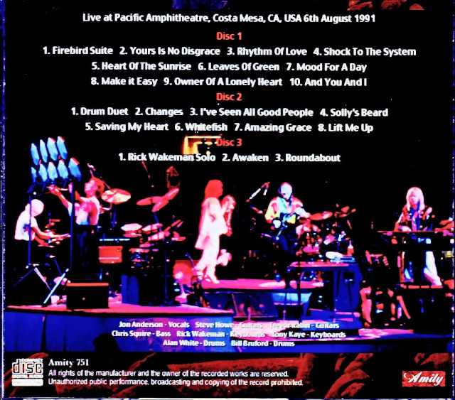 Pacific Amphitheatre, Costa Mesa, CA, USA 6th August 1991 ULTIMATE SOUND Disc:1 (71:38) 1. Firebird Suite 2. Yours Is No Disgrace 3. Rhythm Of Love 4. Shock To The System 5. Heart Of The Sunrise 6. Leaves Of Green 7. Mood For A Day 8. Make it Easy 9. Owner Of A Lonely Heart 10. And You And I Disc:2 (55:08) 1. Drum Duet 2. Changes 3. I've Seen All Good People 4. Solly's Beard 5. Saving My Heart 6. Whitefish 7. Amazing Grace 8. Lift Me Up Disc:3 (34:54) 1. Rick Wakeman Solo 2. Awaken ★13:20 - 13:41 SBD 左右逆転して補填 3. Roundabout Jon Anderson - Vocals Steve Howe - Guitars Trevor Rabin - Guitars Chris Squire - Bass Rick Wakeman - Keyboards Tony Kaye - Keyboards Alan White - Drums Bill Bruford - Drums