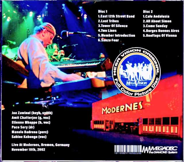 Live at Modern, Bremen, Germany 11/10/2002 Disc 1 1.East 12th Street Band 2.Lost Tribes 3.Tower Of Silence 4.Two Lines 5.Member Introduction 6.Sanza Four Disc 2 1.Cafe Andalusia 2.All About Simon 3.Come Sunday 4.Borges Buenos Aires 5.Rooftops Of Vienna Joe Zawinul (keyb, synth) Amit Chatterjee (g, voc) Etienne Mbappe (b, voc) Paco Seri (dr) Manolo Badrena (perc) Sabine Kabongo (voc)