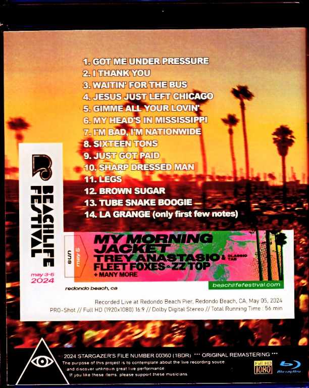 Recorded Live at Redondo Beach Pier, Redondo Beach, CA, May 05, 2024 01. GOT ME UNDER PRESSURE 02. I THANK YOU 03. WAITIN' FOR THE BUS 04. JESUS JUST LEFT CHICAGO 05. GIMME ALL YOUR LOVIN' 06. MY HEAD'S IN MISSISSIPPI 07. I'M BAD, I'M NATIONWIDE 08. SIXTEEN TONS 09. JUST GOT PAID 10. SHARP DRESSED MAN 11. LEGS 12. BROWN SUGAR 13. TUBE SNAKE BOOGIE 14. LA GRANGE (only first few notes) PRO-Shot // Full HD (1920x1080) 16:9 // Dolby Digital Stereo // Total Running Time : 56 min